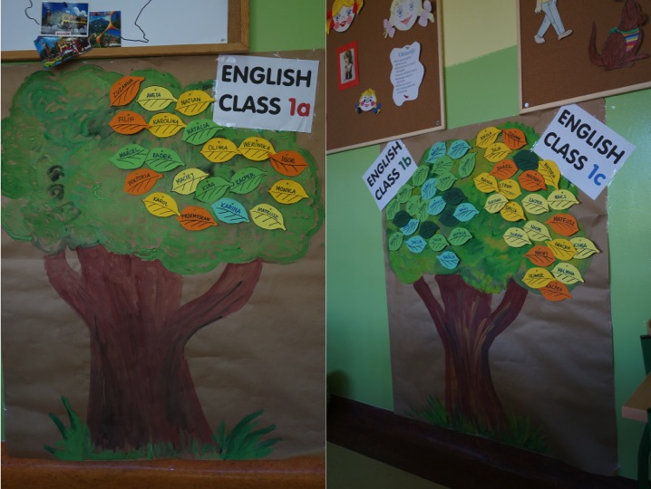 Na koniec lekcji plakietki z imionami sfrunęły z naszych piersi na gałązki dwóch drzew z Lasu Treetops, które magicznie wyrosły w sali 109 i 110. Przy okazji, drodzy Rodzice, zagadka: Ile czasu zajmie nauczycielowi otworzenie, przypięcie/odpięcie i zapięcie 23 agrafek w każdej klasie?