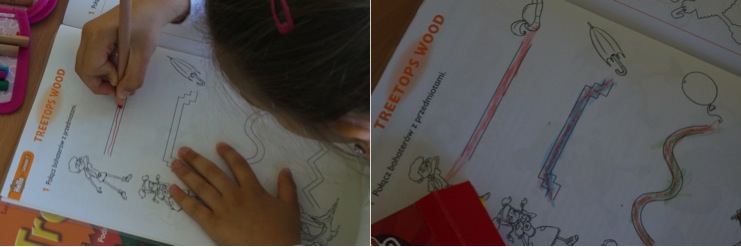 Przy okazji robienia tego ćwiczenia powtarzaliśmy cztery podstawowe kolory, więc każda linia powinna być poprowadzona kredką w innym (ale jednym!) kolorze. Poniżej dwa przykłady jak to się skończyło.