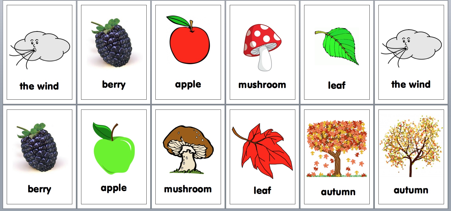 Po dzisiejszych zajęciach nie ma zadania domowego, ale jeśli macie czas i ochotę wytnijcie z obrazka karty i zagrajcie w prostą grę memory (znajdowanie par), żeby utrwalić poznane słownictwo. Obrazki kładziemy obrazkiem do dołu. odwracamy dwa wybrane i nazywamy to, co się na nich znajduje, np. berry – apple. Jeśli to udało nam się odkryć dwie takie same rzeczy to możemy je odłożyć na bok, zdobywamy punkt. Jeśli nie, odkładamy je z powrotem na stół obrazkiem do dołu. Jak widzicie obrazki są podobne, ale nie takie same. Liście czy jabłka mogą wszak mieć różne kolory.
