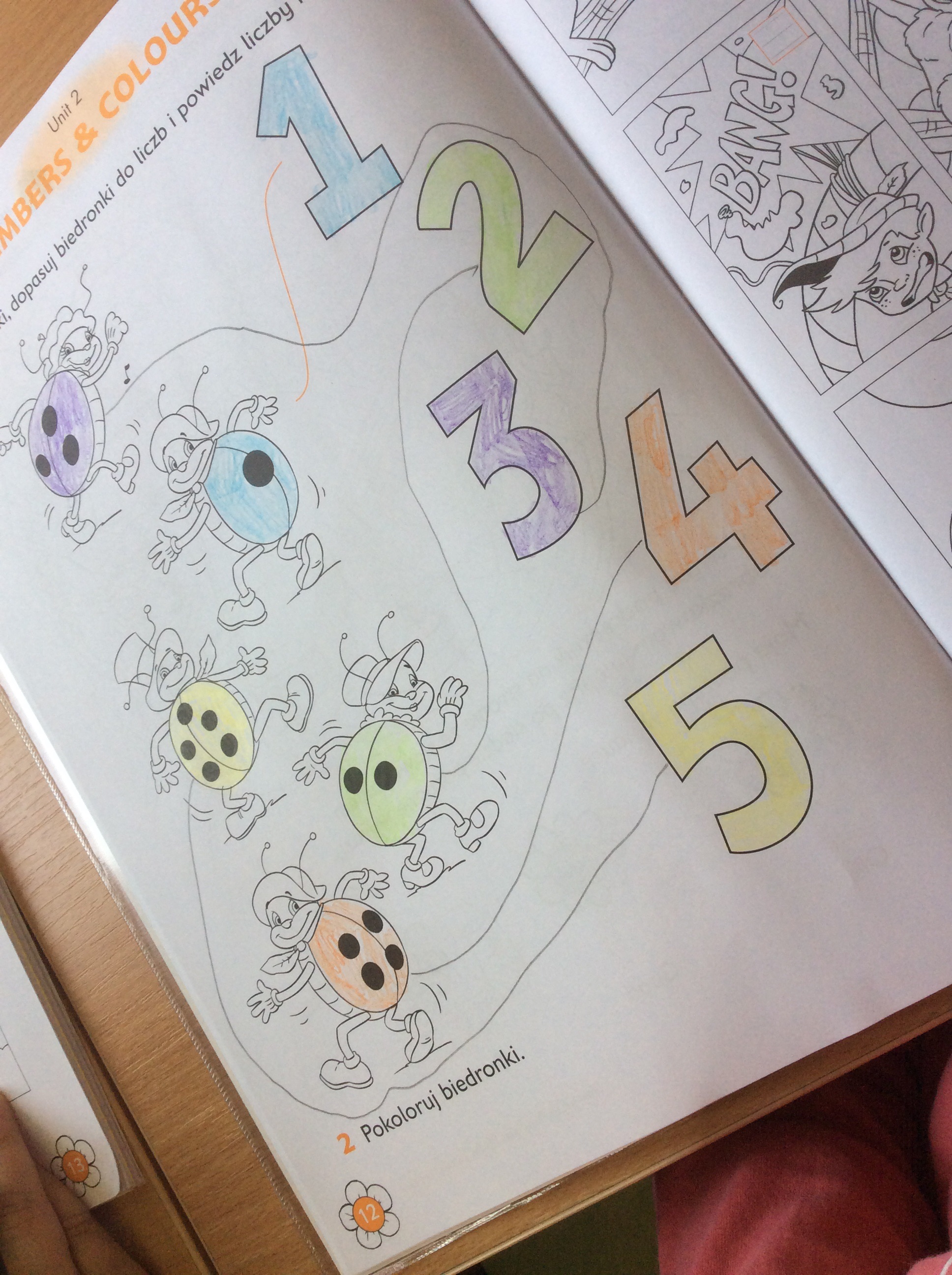 - Powiedzieć w kolejności, a nazwać wskazaną cyfrę, to już zupełnie inna „para kaloszy”. Niektóre dzieci nadal nie rozpoznają cyfr po kształcie. Zupełnie inaczej sprawa się przedstawia, gdy trzeba szybko policzyć coś na obrazku i powiedzieć liczebnik po angielsku. Tak było w ćwiczeniu, które robiliśmy pod koniec zajęć: policz żuczkowi kropki (OK, wyglądają jak biedronki, ale autorki książki upierają się się, że to beetles) i połącz z odpowiednią cyferką. Niektórym poszło to bardzo sprawnie i jeszcze zdążyli parami (cyfra- żuczek) pokolorować, inni mieli małe problemy: liczyli z mozołem po polsku, „przekładali” na angielski, rozpoznawali cyfrę (znowu po polsku), tłumaczyli, i łączyli. SKOMPLIKOWANE i czasochłonne.