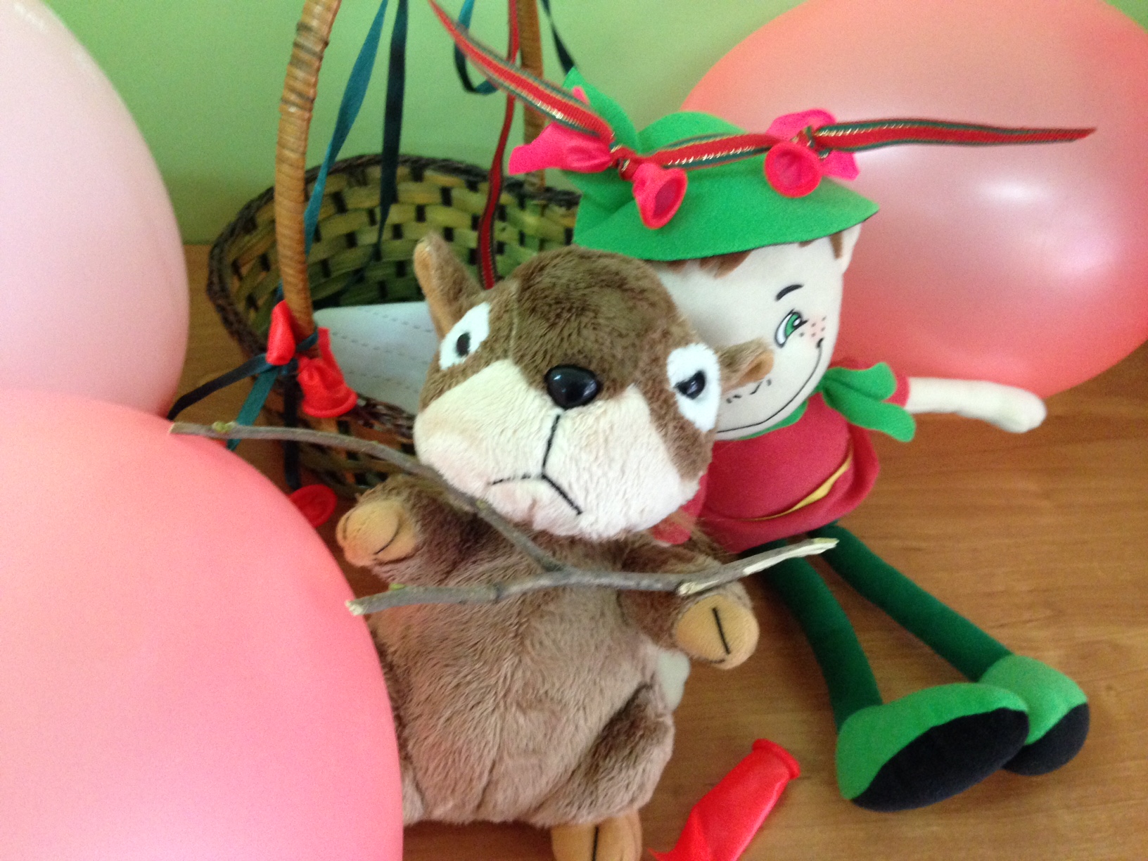 Potem siadamy na dywanie i powoli przestawiam sytuację: Holly, Bud i Hedgehog are in Treetops Wood. Bud is blowing up a balloon (nadmuchuję balon). Dzieci: „O, Pani ma balony!” „Czy one pękną?” No i najważniejsze: „Psze pani JA chcę nadmuchać!” (x 10 głosików).