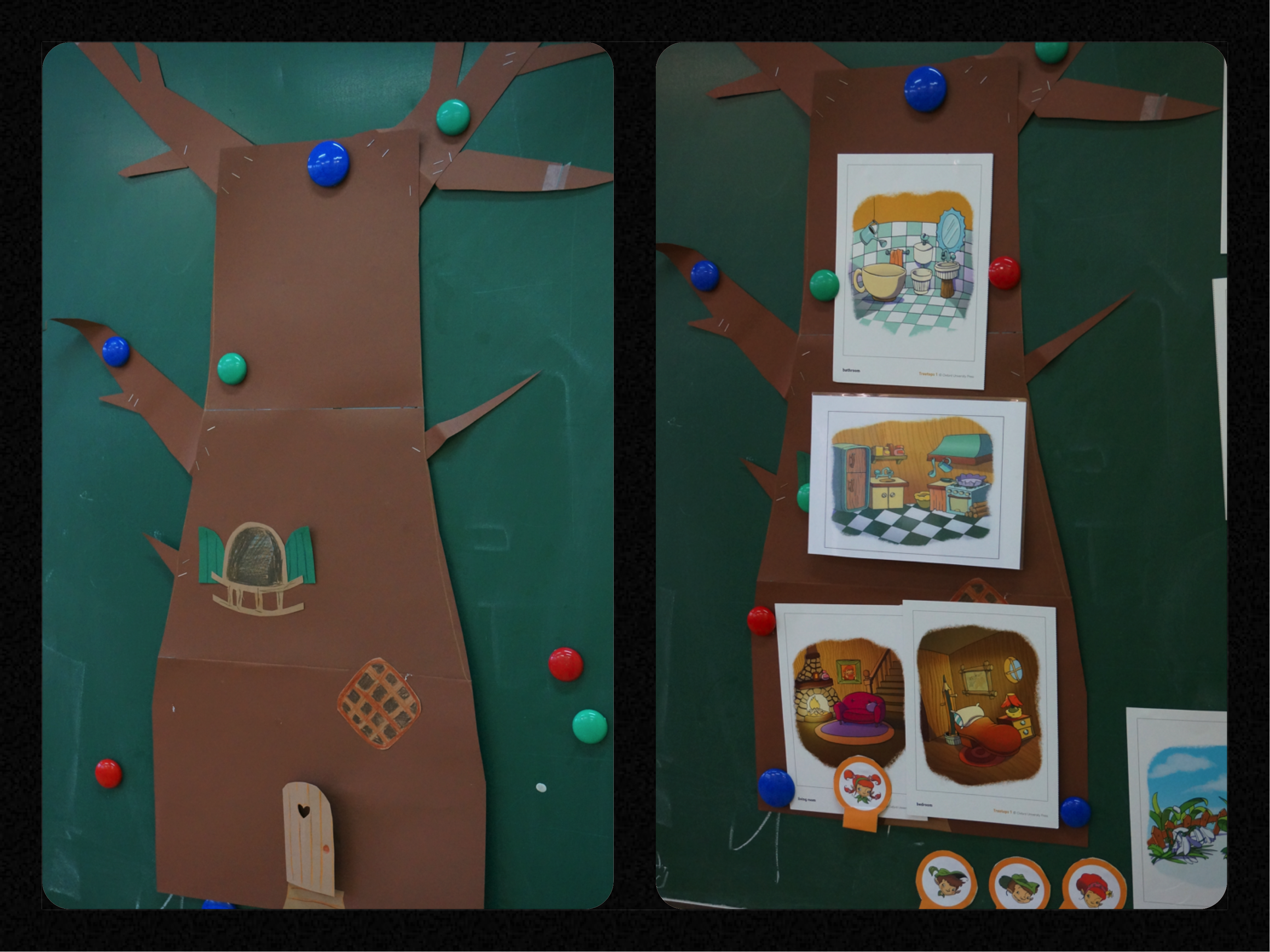Po wprowadzeniu nazw pomieszczeń pokazałam dzieciom na slajdach w jak różnych domach mieszkają ludzie od tippi i igloo po drapacze chmur, poprosiłam by na zdjęciu pokazali mi w jakim domu mieszkają. A potem pokazałam na obrazku z poprzedniej lekcji (zima), że Bud i Holly mieszkają w domku zrobionym w środku drzewa. Skonstruowałam go w wersji makro tablicy ich domu, najpierw z zewnątrz, a potem wewnątrz. Pokazywaliśmy na pomieszczenia i nazywaliśmy je.