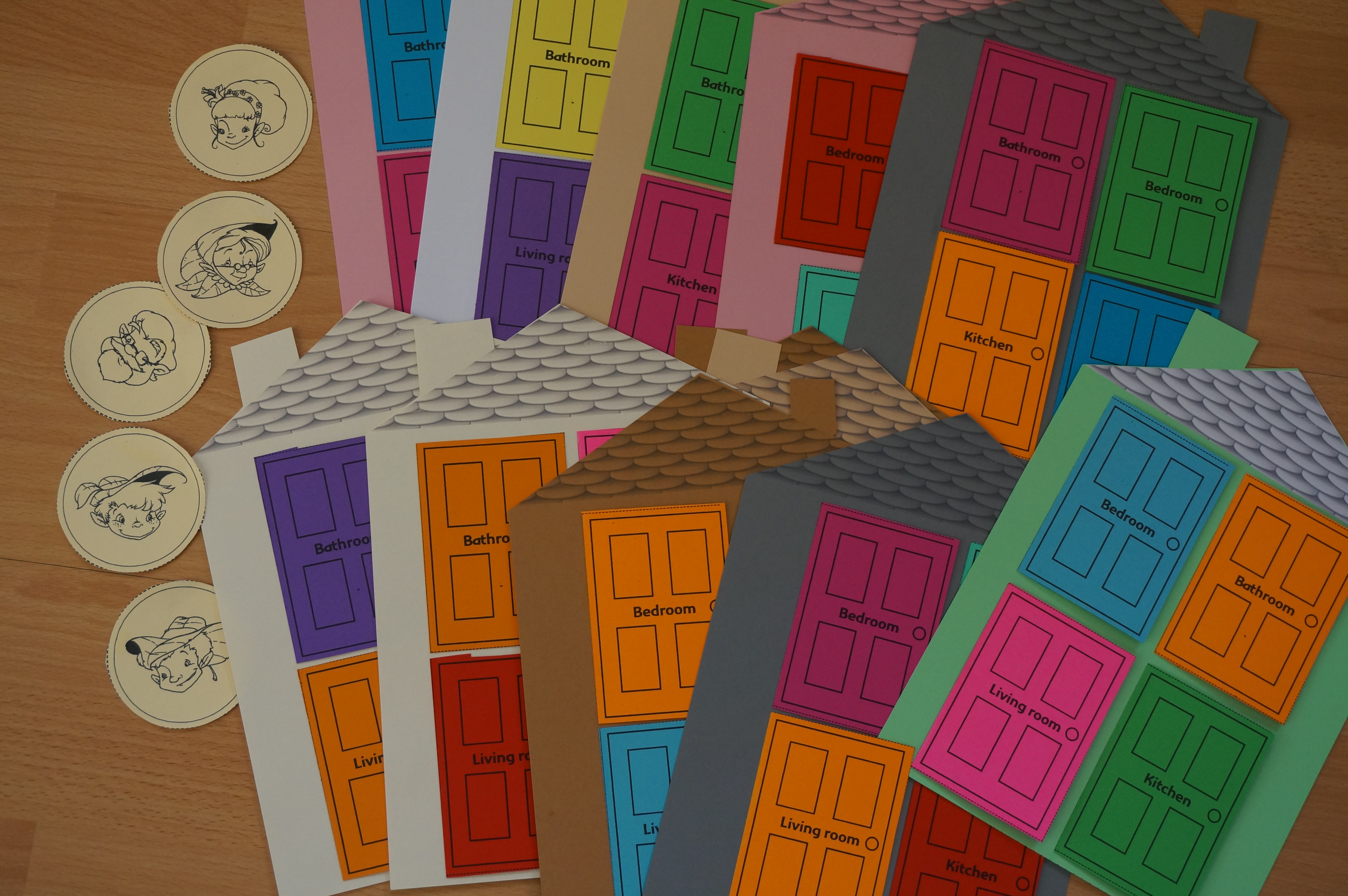 Ja z kolei, mając w perspektywie przemieszczanie się pomiędzy podręcznikiem i zeszytem ćwiczeń oraz znając umiejętności motoryczne moich milusińskich (samo wydarcie str. 77 połowie klasy zabiera sporo czasu! nie mówiąc już o wycięciu, pokolorowaniu drzwi i naklejeniu ich na kartkę oraz zrobieniu dachu i ozdobieniu domu), zrezygnowałam dziś z prac plastycznych (te jutro przy innym zadaniu), a zaoszczędzony czas przeznaczyłam na granie. Oznaczało to niestety dużo pracy dla mnie (po planszy na każdą parę czyli 12 domków plus jedna gigant do pracy na tablicy), ale było warto, bo dzieci poćwiczyły język obcy, a nie tylko rączkę. Kto chce może sobie wykonać planszę w domu. Moje domki są kolorowe i a drzwi skserowane na kartkach z bloku technicznego, bo musiały wytrzymać przynajmniej trzykrotne granie. Musiałam być pomysłowa, bo wizja kolorowania 48 drzwi była mało kusząca. Ale za to dodałam ładne dachówki na dachu oraz komin, których na podręcznikowym szablonie nie ma.