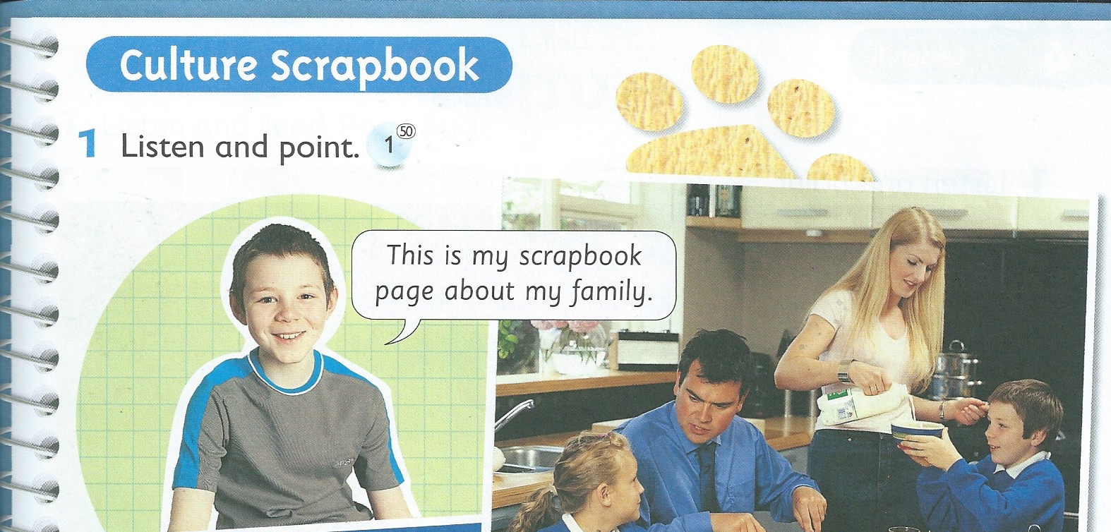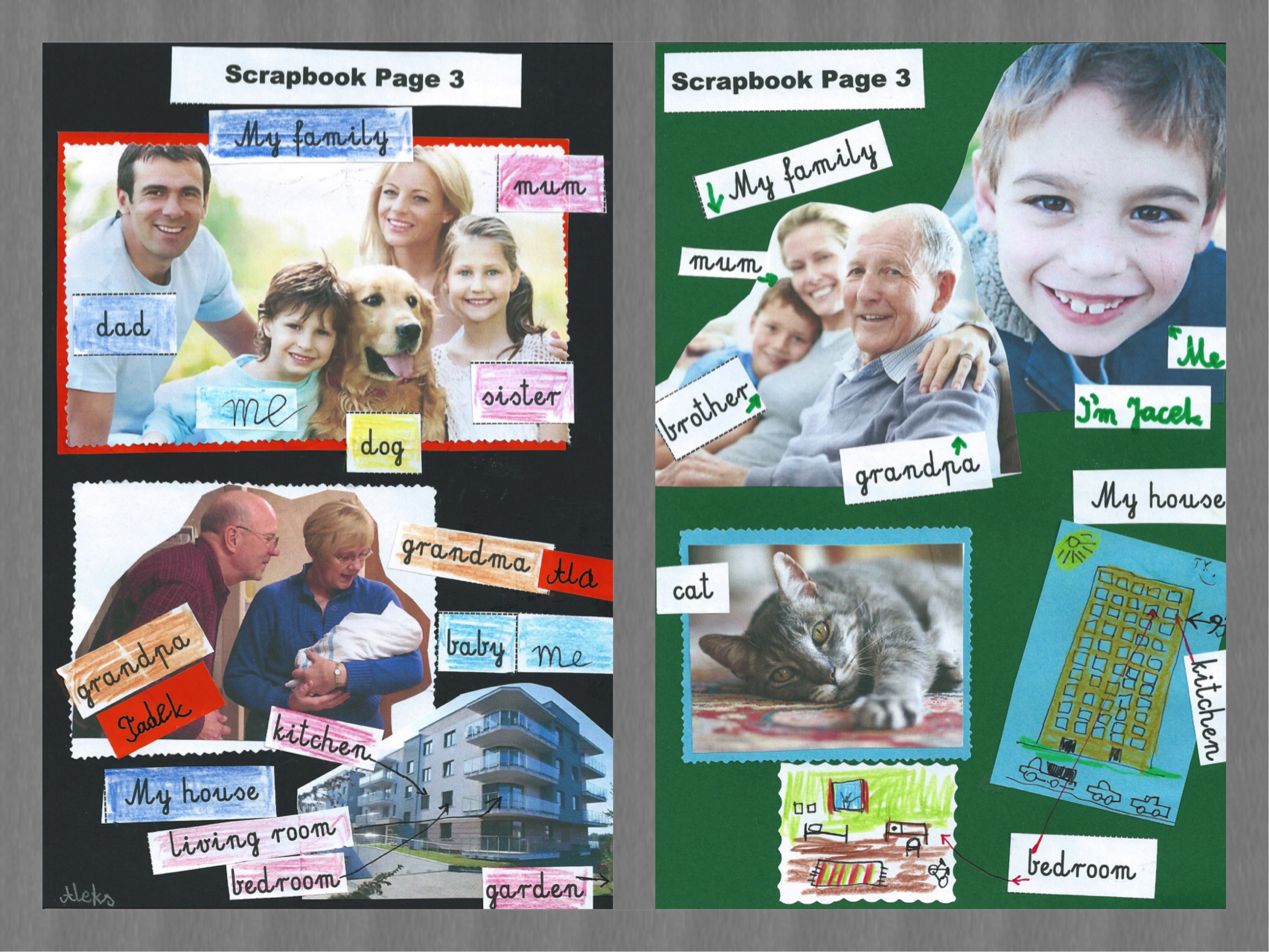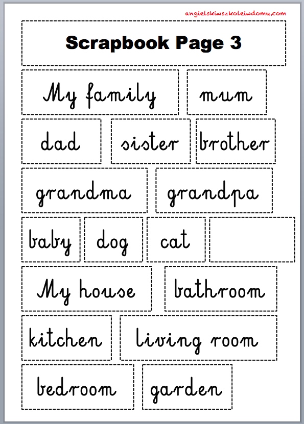 Najpierw jednak posłuchaliśmy jak Adam, jedno z dzieci przedstawionych w podręczniku, opowiada co umieścił na swojej kartce do scrapbookowego albumu (str. 29). Omówiliśmy kolejno zdjęcia. Na tym etapie dzieci już „przebierały nogami”, tak bardzo chciały porozmawiać o swoich domach i rodzinach. Dostały zatem materiały, które wcześniej przyniosły i powiedziałam, że właśnie poprzez kartkę opowiedzą mi o swoich bliskich. Dostały też kartę z różnymi słowami, którymi „podpisywały” swoje zdjęcia. Ponieważ dzieci pracowicie uczą się czytać na języku polskim zachowałam konwencję pisma elementarzowego, żeby ułatwić im czytanie i ewentualne dopisywanie innych słów.