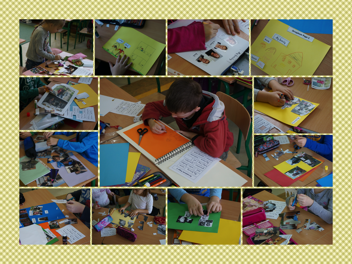 Dziś najpierw rozgrzewka/powtórka, a potem 5 minut maksymalnego skupienia – napisaliśmy test z rozdziału trzeciego (E, tam, łatwizna, piece of cake. To już nasz trzeci sprawdzian, więc dzieciom idzie coraz lepiej.) A potem 35 minut twórczości artystycznej – wycinanie zdjęć albo rysowanie, decyzje strategiczne: co i gdzie ponaklejać, jak ozdobić, jak przykleić podpisy … Słowem: dużo pracy i można się wykazać pomysłowością.
