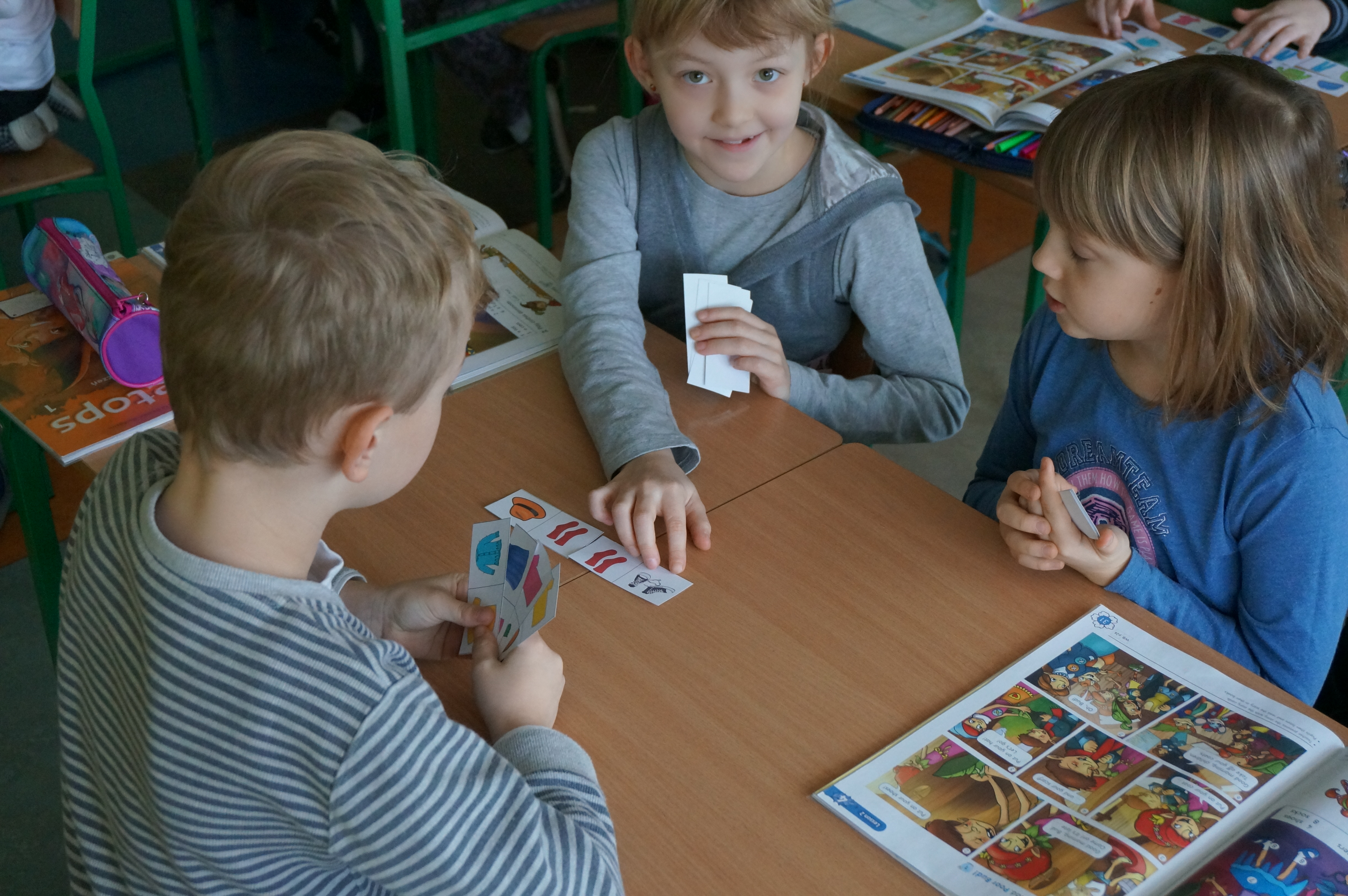 A wisienką na torcie dzisiejszej lekcji było granie w parach w Clothes Dominoes. To, które jest dołączone do książki nauczyciela Treetops 1 nie podobało mi się, bo raz, że czarno białe; dwa, dzieci miały je same wyciąć (10 minut z lekcji jak nic!), trzy, że bardzo trudno tak grać, by się ładnie początek spotkał z końcem, o co chyba chodzi w dominie. Tak więc opracowałam własną planszę i jeśli chcecie Państwo pograć z dziećmi można kartę pobrać TU -> Clothes dominoes i wydrukować na sztywnej kartce. Jedna uwaga: wykładając kartę na stół należy po angielsku nazwać ciuchy na obrazku, no w każdym razie byłoby fajnie gdyby chociaż dzieci to robiły, jeśli Państwo nie znacie angielskiego. Jeśli zapomnimy słówka, można sprawdzić w podręczniku na str. 30. Domyślając się, że x-boxy, playstation i inne tabletowe Minecraft’y i Angry Birds wykosiły już poczciwe gry znane mi z dzieciństwa – warcaby, chińczyka, domino etc., najpierw z jednym uczniem pokazałam jak się gra w poczciwe domino. Kart było mniej niż w zestawie uczniowskim, ale za to były na tyle duże, by każdy w klasie mógł je zobaczyć. Dla nauczycieli, którzy zaglądają na moją stronę szablon TU -> Clothes dominoes BIG. Potem z graniem nie było już (zasadniczo) problemów, za to przypomnieć sobie te wszystkie nowe słówka było dużym wyzwaniem. No, ale o to przecież chodzi: o wyzwanie! Oraz o ćwiczenie w atrakcyjny dla dzieci sposób.