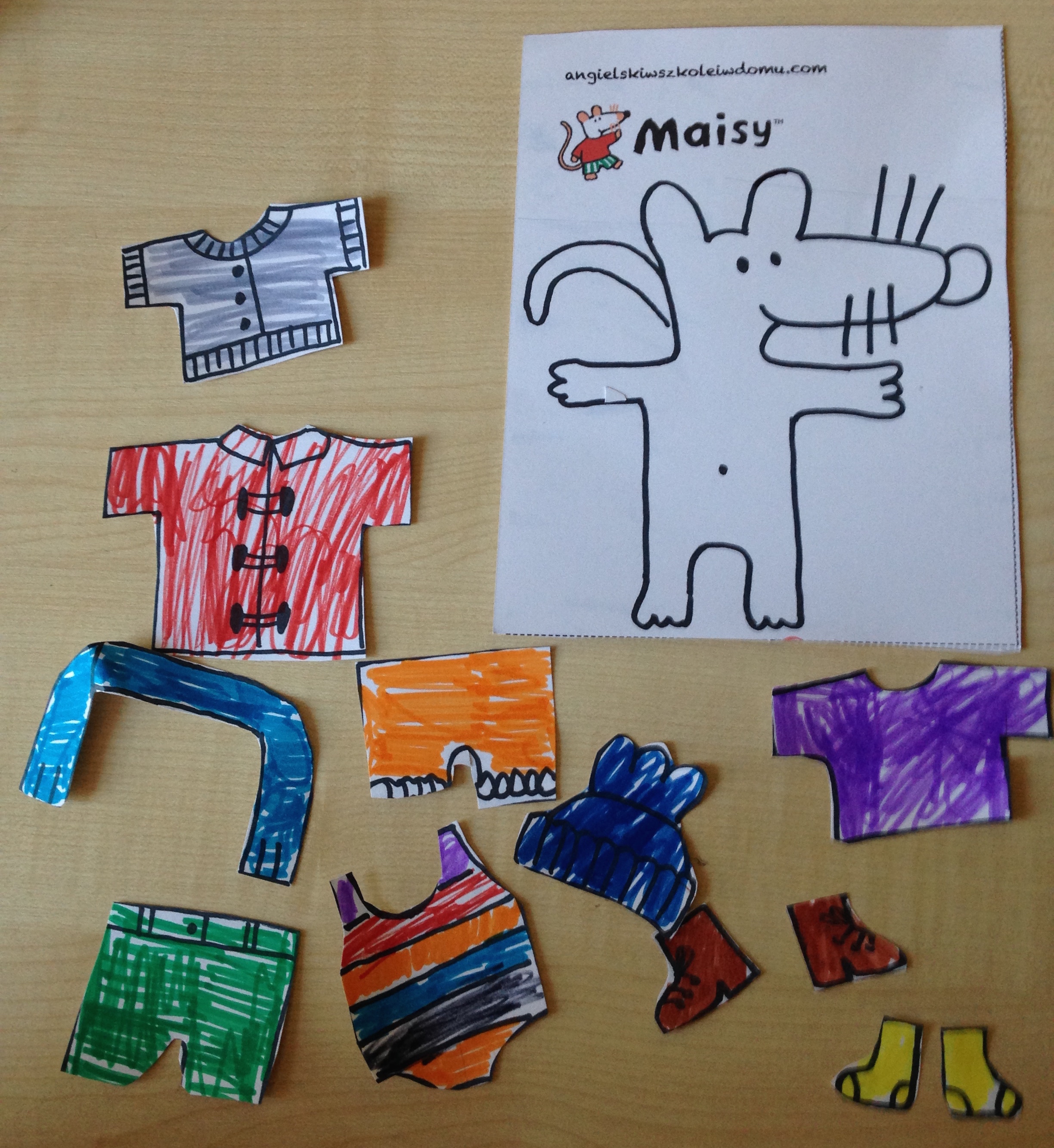 Dziś kolorów ciąg dalszy, a na deser na kanwie książeczki Maisy goes swimming specjalnie zaprojektowane przeze mnie zadanie: kolorowanie i wycinanie ubranek Maisy. Wszystko w biegu, bo albo lekcja znowu zaczęła się z poślizgiem, albo musiałam skończyć wcześniej (wyjście na koncert), albo jeszcze coś innego. W przyszłym tygodniu muszę zaplanować dla dzieci jakieś „ślimacze aktywności” zanim wszyscy padniemy na nos.