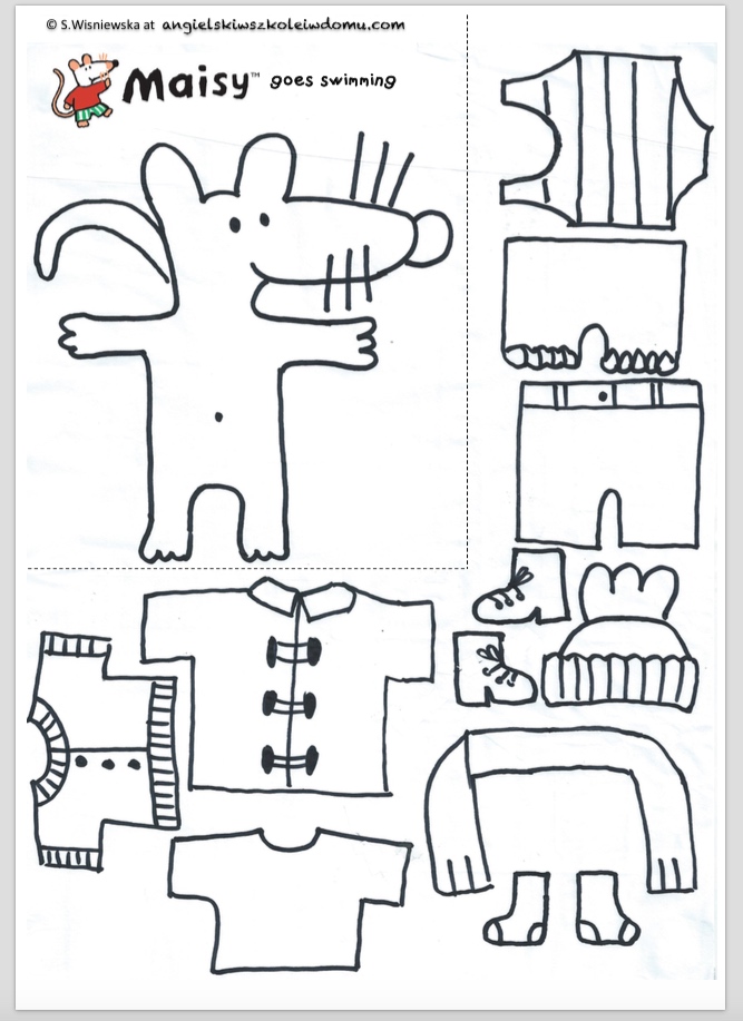 W związku z tym, że tylko około połowie dzieci w uczonych przeze mnie klasach udało się ukończyć wycinanie (reszta obiecała dokończyć w domu), to co chciałam zrobić z tymi elementami – ubieranie i rozbieranie Mysi – zostawiamy na następną lekcję. Ciekawe ile kopert z wyciętymi rzeczami Mysi zostanie w domu? Ile skarpetek i bucików się po drodze zgubi? Aż strach myśleć… Jeśli coś (lub wszystko) się zgubi, zawsze można zacząć od początku, bo arkusz z dzisiejszym zadaniem do pobrania TU–>Maisy goes swimming_cut out