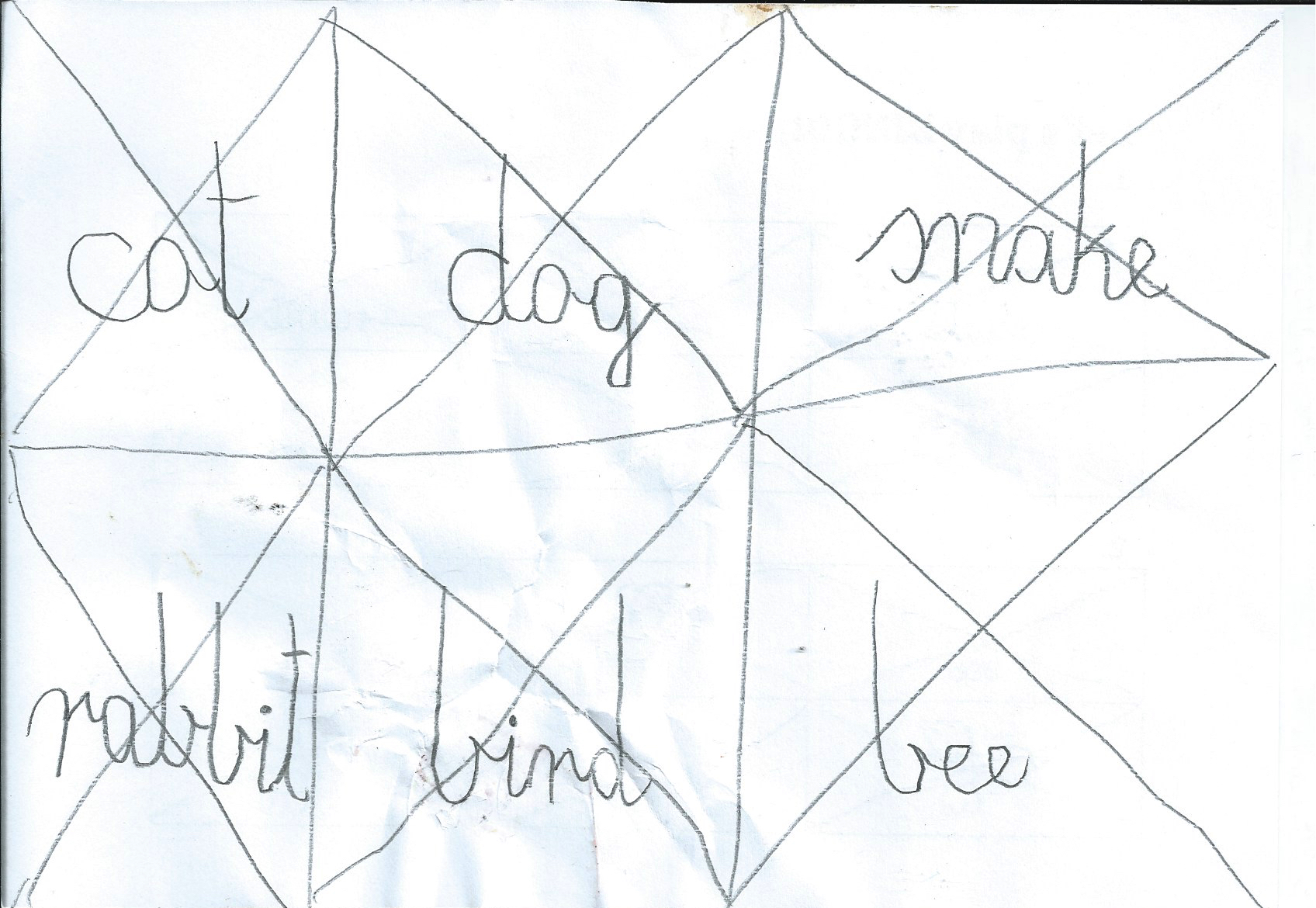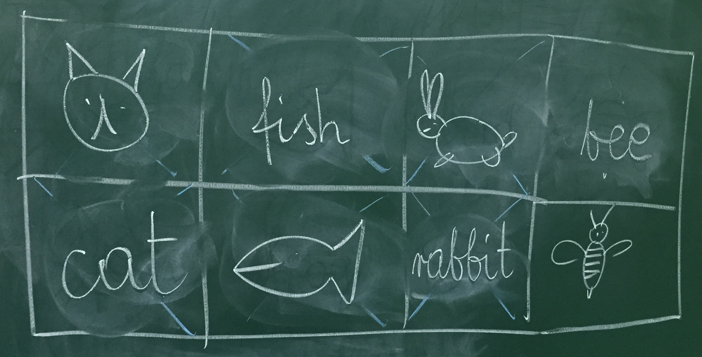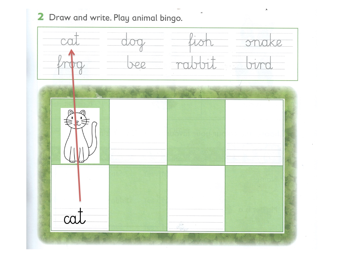 Trudno. Przed przejściem do drugiej rundy (na planszy z nr. 2) każę im wymazać krzyżyki. Przed drugą rundą trzeba narysować obrazki, każda z grup ma już wpisane słowami trzy nazwy zwierząt. Znowu mam slajd pomocniczy do wyjaśniania: „Tu narysuj i tu, i tu. Razem trzy. Three pictures, Jak dzieci kończą rysowanie to szybko na tablicy przerysowuję jedną z plansz i rysuję trzy obrazki. Mówię: „To plansza dla mnie, wy macie swoje”, ale i tak w każdej klasie zobaczyłam dwoje, troje uczniów, którzy na widok tablicy, w pocie czoła wymazali swoje obrazki i przerysowali moje. Gee, ta zielona tablica działa na dzieci jak sygnalizator na psy Pawłowa: „Cokolwiek Pani napisze = przepisać.” Probne bingo Żeby uniknąć niezdrowej rywalizacji (a niestety każda gra wzbudza w dzieciach przemożną chęć wygrania, do tego stopnia, że co niektórzy krzyczą Bingo! po pierwszym przeczytanym przeze mnie słowie wylosowanym z torby) gram do momentu, aż każde dziecko ma skreślone sześć pól. Zawsze też, jak ktoś po raz pierwszy krzyknie Bingo! to jak w pokerze zatrzymuję grę i mówię „sprawdzam” (Let’s check if you really have Bingo): podnoszę z ławki odłożone (przeczytane) kartoniki, podchodzę do dziecka, czytam i kładę mu/jej na kartce. Zawsze się wtedy okazuje, że czegoś brakuje, że nie ma Bingo. Kiwam placem i mówię: „Don’t cheat! Let’s continue playing” to w ramach ekspozycji na nowe zwroty. Ok. Jesteśmy w miarę gotowi na podręcznikowe Animal Bingo. Nie otwieramy książek. Nie, nie, jeszcze nie. Dzieci nie są wielozadaniowe. Jak otwierają książkę, to nie słuchają wyjaśnienia, jak co zrobić. Jak otworzą książkę, to zaczną robić ćwiczenie „po uważaniu”, jak im się wydaje, że powinno być. Jedna rzecz na raz. Muszę zmusić wszystkich do wysłuchania polecenia. A więc upewniam się, że „all eyes are on me„, czekam, czekam, czekam… OK. Wszyscy patrzą, slajd, najpierw pusty (wygląd fragmentu strony, specjalnie bez jej numeru, żeby nie zaczęły otwierać podręcznika), wyjaśniam „Zielone pole – rysujemy obrazek, białe pole podpis do obrazka”. Rysuję kota (klik, pojawia się na slajdzie rysunek kota) w zielonym polu, w białym podpisuję cat (pojawia się podpis pismem elementarzowym). Jeśli nie pamiętam jak się pisze kot po angielsku sprawdzam literki tu (klik, pojawia się strzałka). Tak wygląda ten slajd po prezentacji.