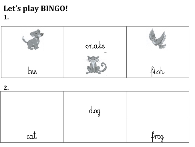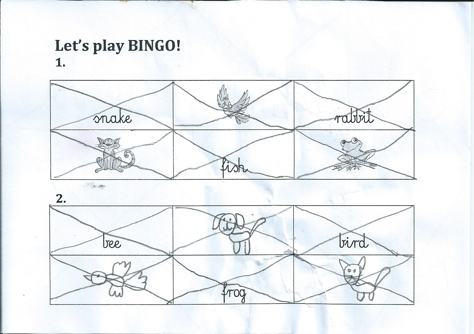 Bingo! Bingo! Bingo! to dziś najczęściej powtarzane słowo – z sensem i bez 😉 Dzieci kochają gry i zabawy, ale nauczyć je zasad grania …  O, to zabawne wcale nie jest! Ale o tej prawdzie rzadko się wspomina na kursach metodycznych dla nauczycieli. Ja wspominam, ale nikt mi nie wierzy. Do czasu aż sami przeżyją taką lekcje jak te moje dzisiaj…. Bingo. Co w tym trudnego? Gracze zakreślają na planszy cyfry (w naszej językowej rzeczywistości słowa lub obrazki), które inny gracz wyczytuje. Świetne ćwiczenie na rozumienie ze słuchu. Kiedyś już graliśmy, więc powinno być łatwiej. Ale i wtedy i teraz po lekcji wychodzę z lekkim bólem głowy, bo mi się tam kłębią pytania w stylu 1. dlaczego niektóre dzieci ni w ząb nie mogą zrozumieć, że gramy na jednej planszy; 2. że nie skreślamy co nam się żywnie podoba, ale tylko to co usłyszą oraz 3. dlaczego podczas zabawy są takie dzieciaki, które przez cały czas trwania danej rundy, czyli już po pierwszym wylosowanym przeze mnie kartoniku, będą krzyczeć Bingo! No kto, kto mi odpowie na te pytania? A więc ilekroć w książce widzę pomysł na „granie”, Bingo, memory, mazesnap czy cokolwiek innego, to naokoło głowy zaczyna mi się wyświetlać taki niebieski policyjny kogut, Eo! eo! Serio. No ale jest problem, musi być i rada. Dziś kilka trików jak mimo przewidywanych problemów sprawić, by 99% klasy „skumało” o co w tym graniu, dziś w Animal Bingo, chodzi. Animal mazeGrunt to dobra rozgrzewka, bo dzieci muszą umieć skojarzyć słowo-znaczenie-obrazek (lub zapis). Możemy skorzystać z kart obrazkowych, możemy wyświetlać obrazki na tablicy, potem zaśpiewać piosenkę. W Snake Song występują wszystkie potrzebne nam zwierzaki, ale z doświadczenia wiem, że niektóre dzieci całkiem sprawnie śpiewają piosenkę, ale jak poprosimy, by na tablicy wskazały obrazek ilustrujący wypowiadane przez nas słowo np. snake, to nie potrafią. Produkcja a recepcja – to dwie różne umiejętności. Zagraliśmy więc online w Maze, bo tam właśnie są wykorzystywane umiejętności dzisiaj nam potrzebne: pani mówi słowo i trzeba kliknąć w odpowiedni obrazek i pomóc wiewiórce przejść labirynt. Animal Bingo1 2Tak rozgrzani przechodzimy do ćwiczenia w podręczniku (str. 43, książki zamknięte): puszczam nagranie z odgłosami (miauczenie, szczekanie itp.) zwierząt a dzieci zgadują kto to taki. Slajd wyświetlany na tablicy pokazuje obrazki z ośmioma zwierzętami, rozpoznawanie nazw których dziś ćwiczymy.