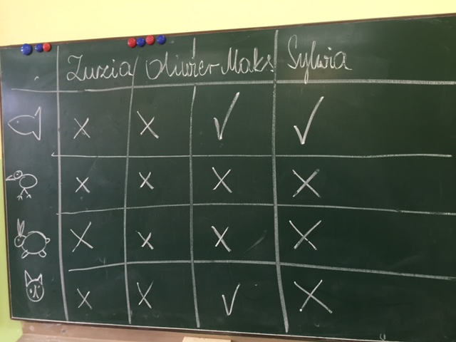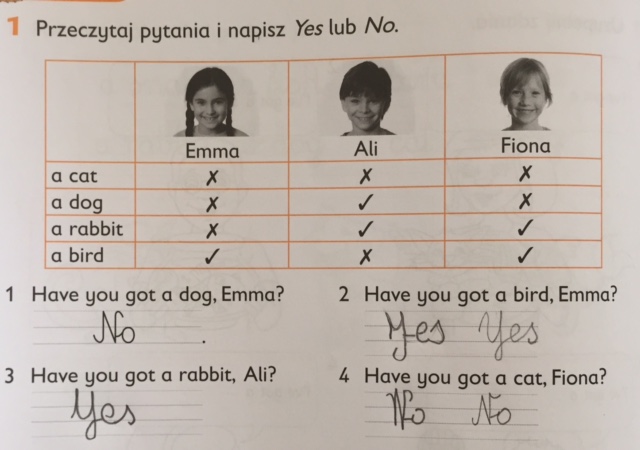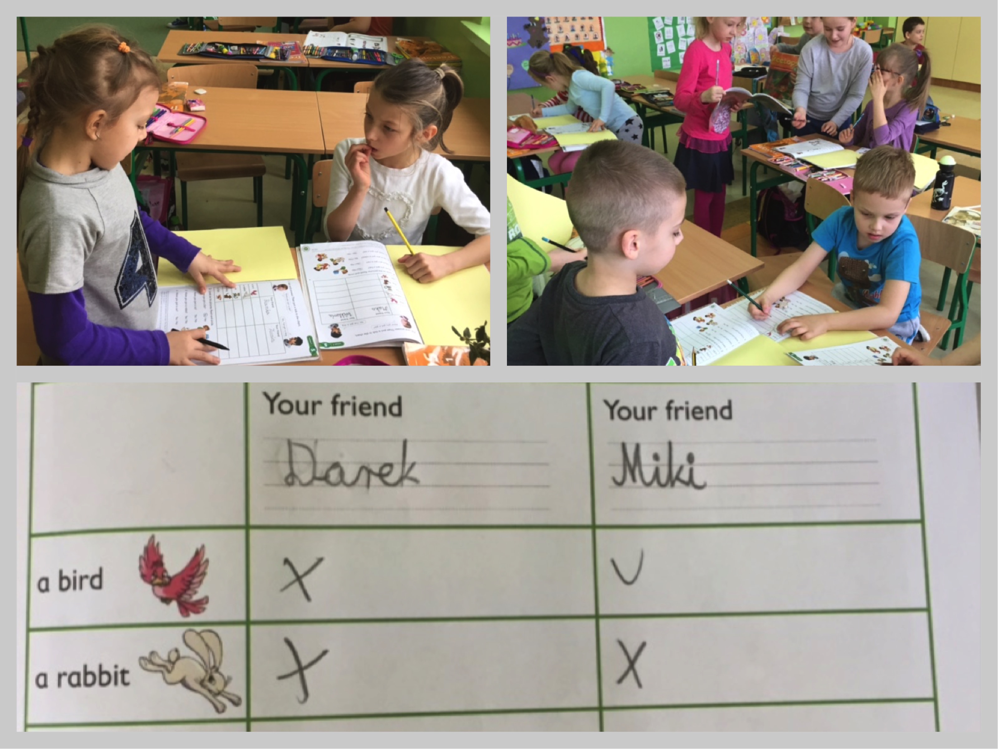 zaznaczyłam odpowiedzi krzyżykiem i „ptaszkiem” w odpowiednich rzędach. Potem taki sam dialog przeprowadziłam z dwojgiem dzieci z klasy, a na koniec proszę by dziecko zapytało mnie. Kilka razy chórem powtarzamy kluczowe pytanie: Have you got a pet? i różne opcje odpowiedzi. W ten sposób dochodzimy do ćwiczenia z podręcznika ze str. 45: Zapytaj, odpowiedz i postaw znaczek w tabeli. Po sprawdzeniu, że wszyscy wiedzą na czym polega, puszczam dzieci „samopas” i czekam jak sobie poradzą ze swoim pierwszym zadaniem typu a class survey (ankieta klasowa). Było trochę zamieszania, ale byłam zadowolona, że w większości dzieci próbowały zadawać pytania po angielsku i na nie odpowiadać. Oczywiście niektóre głośno narzekały, że „one też chciały przy tablicy” i że „mnie to pani nigdy nie wybiera”. Dla mnie takie odpytywanie przy tablicy to tylko modelowanie ćwiczenia, dla nich „zabawa z panią”.
