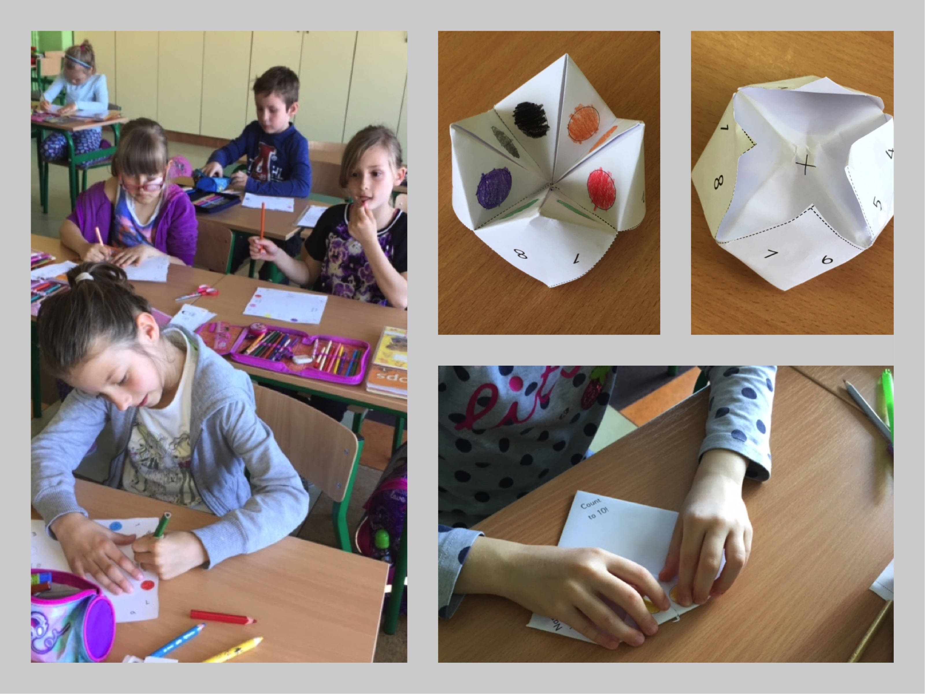 Jak już też pisałam, dzieci są na ogromnie zróżnicowanym poziomie manualnym i zrobienie prostej składanki origami to istny „ból głowy”. Tak się dzisiaj natłumaczyłam i napomagałam („Psze pani, a mnie tu się rozdarło” „A mnie nie wyszło” „A gdzie te palce wsadzić?”), że zwątpiłam czy tego typu zabawkę da się z 7-8 latkami zrobić w 10 minut, by starczyło czasu na zabawę po angielsku czyli to, o co mi chodziło najbardziej. U mnie nie starczyło.