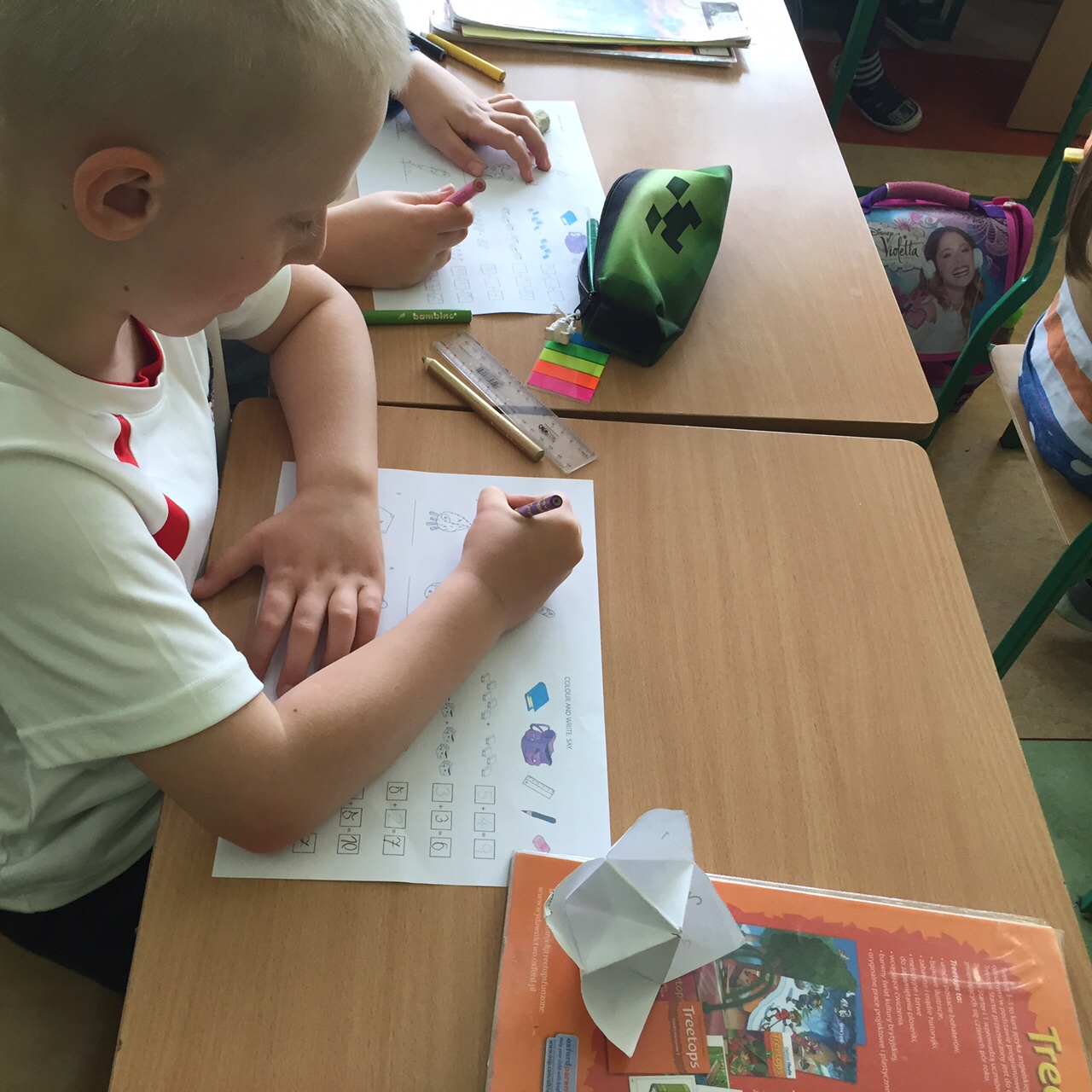… czyli powtórzmy rozdziały 5-6. Oprócz zwierząt, części ciała i cyfr od 1-10, jeszcze przypomnieliśmy sobie dzisiaj rzeczy znajdujące się w klasie. Liczyliśmy krzesła (How many chairs?), ławki, książki, i tak dalej.