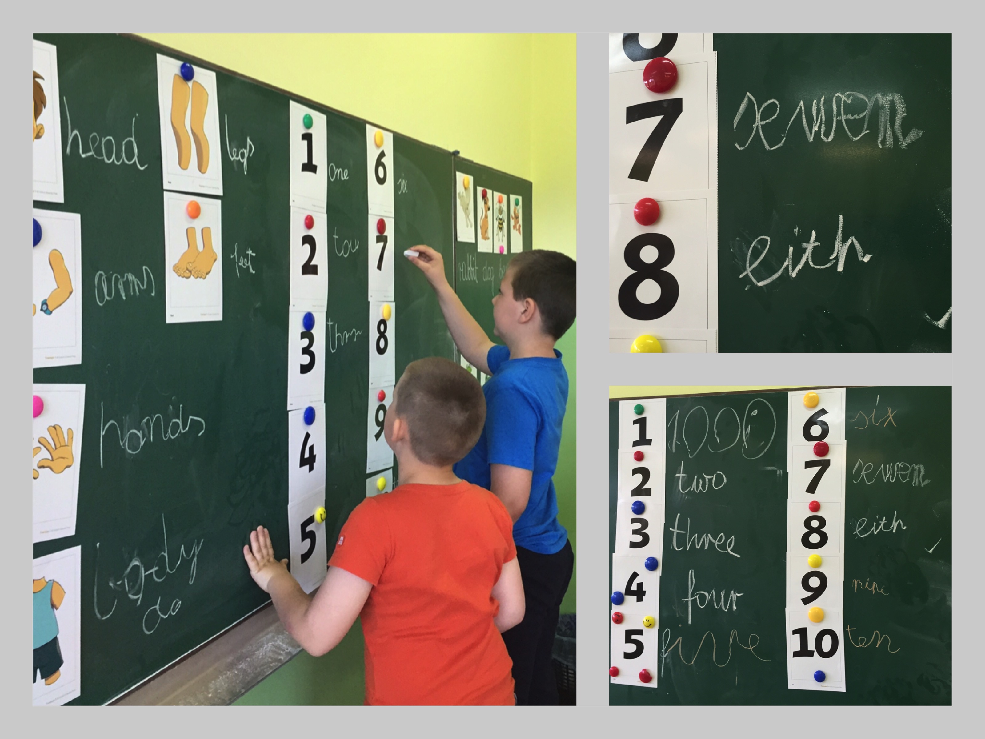 Poza tym wszystkie dzieci miały okazję napisać przynajmniej jedno słowo na tablicy (hurra!), bo systematycznie, przy każdej partii materiału, przypominaliśmy sobie pisownię poznanych wyrazów. Zdjęcia poniżej przedstawiają dzieci przy pracy i wersję przed korektą. Dla nas dorosłych wydaje się to niepojęte, że dzieci po tylu miesiącach nauki są święcie przekonane, że jak słyszą five to trzeba napisać fajf i są szczerze zdziwione gdy dowiadują się, że niekoniecznie tak właśnie jest. „Serio?! Nie pisze się tu? Czemu?” – pytała dziś Jadwinia. Dzieci są zdziwione już od pewnego czasu czyli konkretnie od 26 listopada (My family), kiedy to po raz pierwszy pojawiła się pisana wersja nowych słów i elementy czytania i pisania po śladzie. I niestety muszę Państwa zmartwić: w wielu przypadkach to zdziwienie i błędy w pisaniu będą jeszcze długo, długo trwały. Nie jest to problemem, bo dzieci w klasach 1-3 nie muszą według Podstawy Programowej opanować formy pisanej wyrazów; muszą tylko mając wyraz umieć go przeczytać, rozpoznać znaczenie i skopiować (przepisać).