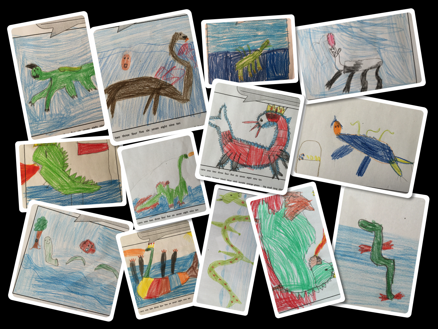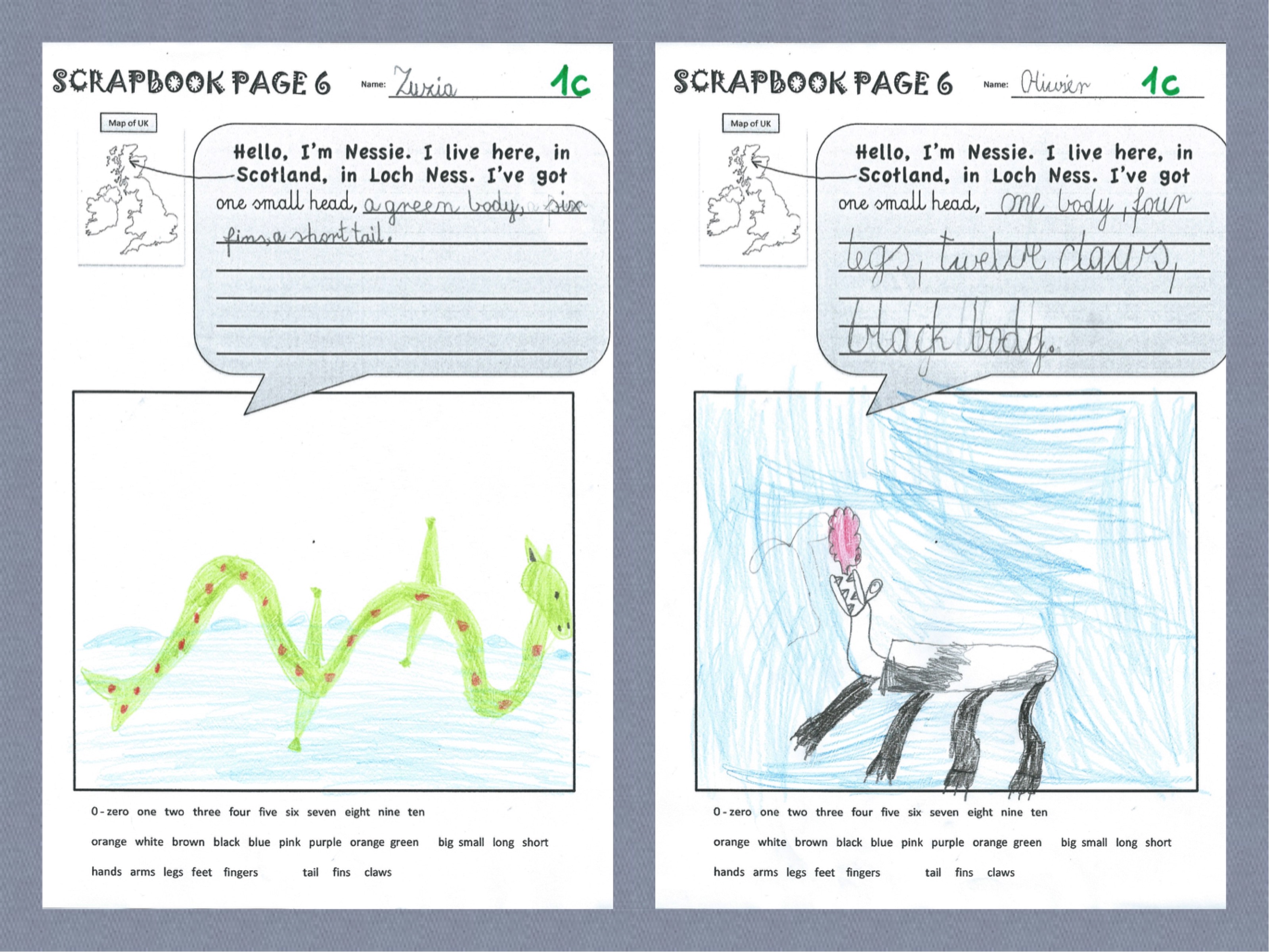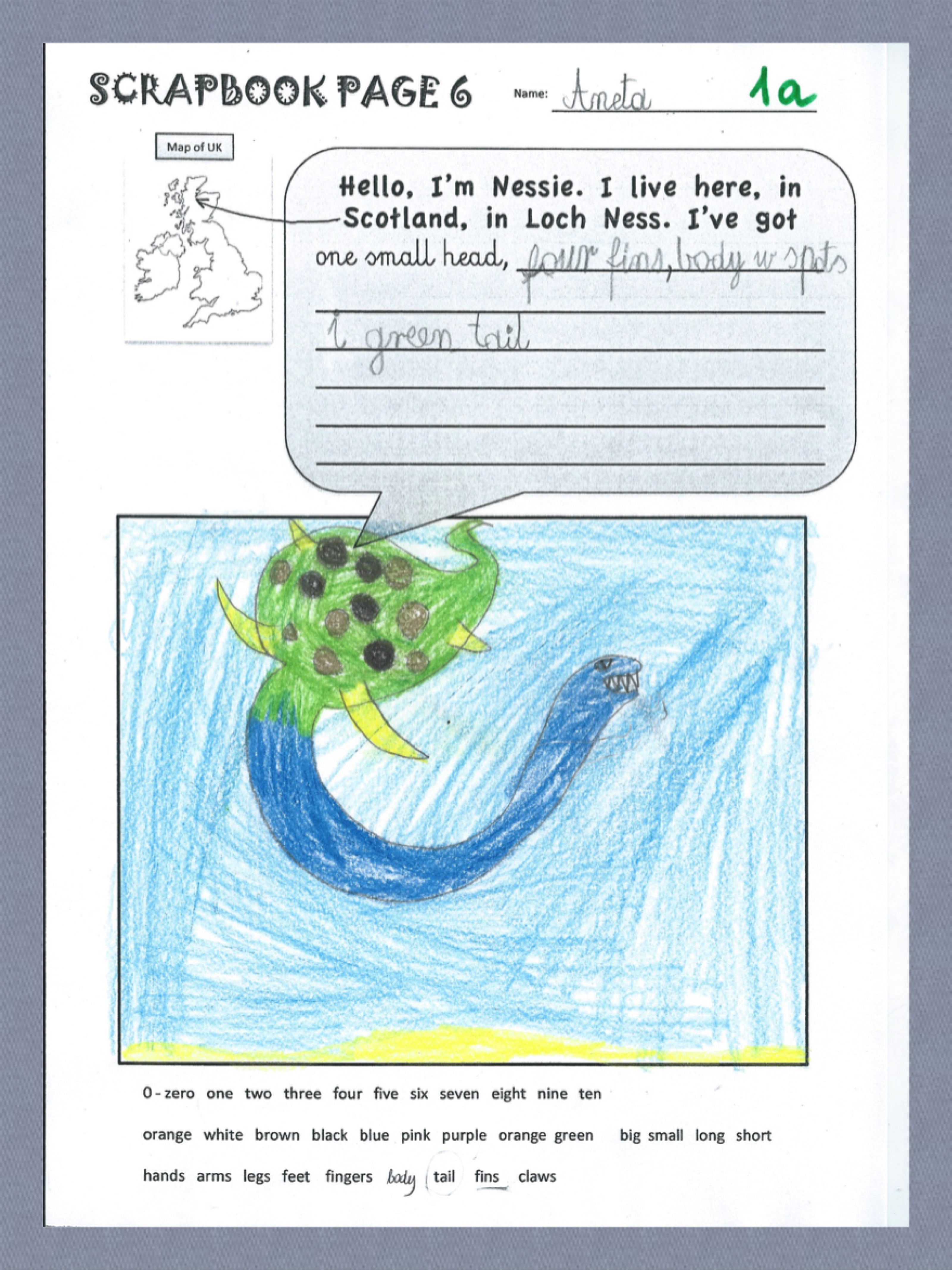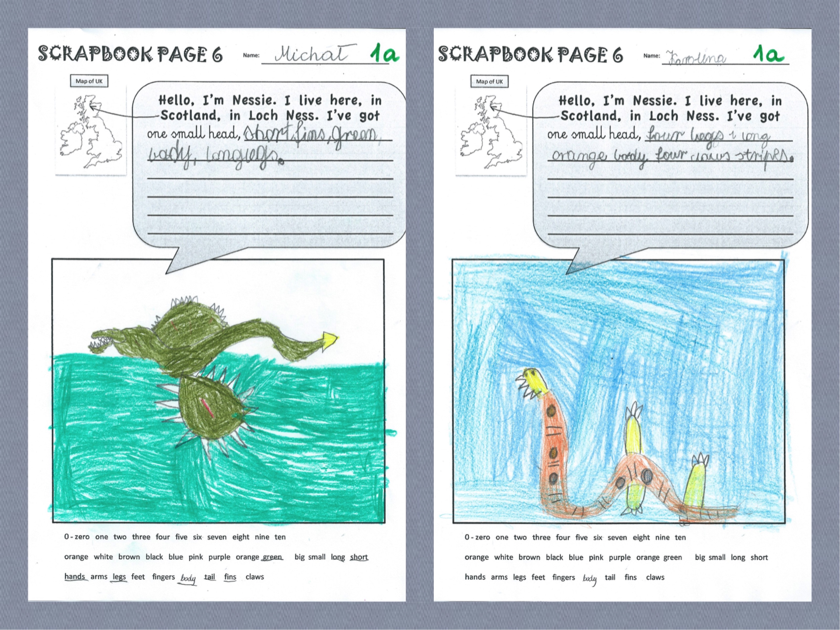 Wielu z moich małych uczniów z iście eksperckim 🙂 zacięciem zaczęło mi tłumaczyć: „Ja po prostu wiem, że to smok, psze pani”. „Ona tam żyje w jaskini, w wodzie, ale czasami wychodzi i lata” „Nie, nieprawda, ona pływa. Tak jak dinozaur. I jest czarna. Jak noc.” itp. itd. Świetny wstęp do bardzo kreatywnego zadania, które było przed nami: 1. Narysuj Nessie. 2. Pokoloruj. 3. Opisz jak wygląda. (Arkusz do pobrania TU–> Scrapbook Page 6_Nessie)