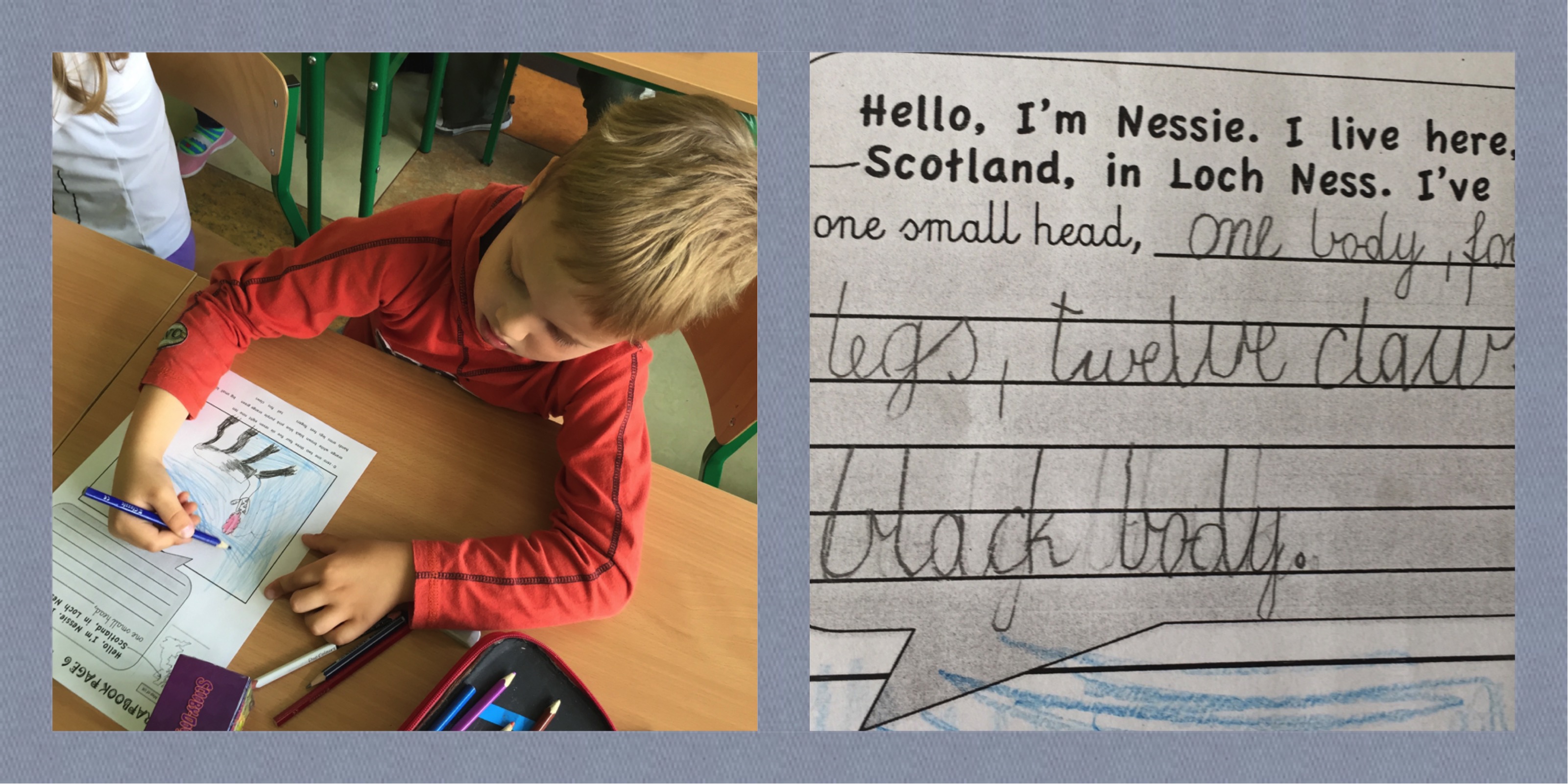 A potem przenieśliśmy się do Szkocji. W tym miejscu nastąpił pokaz na mapie: tu Anglia, Londyn, Królowa, tu Szkocja, piper, Inverness i jezioro Loch Ness. W podręczniku (str. 54) Album o Kulturze dotyczył niezwykłych sportów i zawodów, ale uznałam, że to dla dzieci za trudne, i językowo i merytorycznie. Skoro tyle ostatnio mówiliśmy o częściach ciała oraz wielorękich i wielonożnych potworach uznałam, że ciekawiej będzie odpowiedzieć na pytanie, których wielu bardzo nurtuje: Czy Nessie, potwór z Loch Ness, istnieje naprawdę? A jeśli tak, to jak wygląda? W końcu Nessie to dobro narodowe, istna (żywa?) legenda Wielkiej Brytanii.