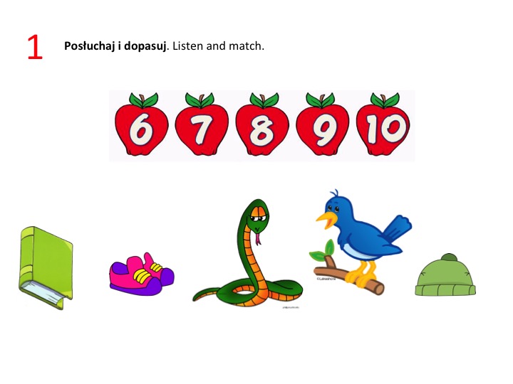 Zgodnie z obietnicą zaczęliśmy dzisiejszą lekcję od sprawdzianu z materiału z rozdziałów 5-6. Najpierw jednak zrobiliśmy 5-minutową rozgrzewkę. Przy pomocy obrazków i wyrazów wyświetlanych na slajdach w PPT powtórzyliśmy wszystkie słówka. Potem pokazałam dzieciom – zadanie po zadaniu – jak będą brzmiały polecenia i co należy w kolejnych zadaniach zrobić. Wybrani uczniowie podchodzili do tablicy i robili przykładowe zadania. Potem znowu kolejny set słówek i kolejne polecenie i przykłady. I tak samo z trzecim zadaniem.