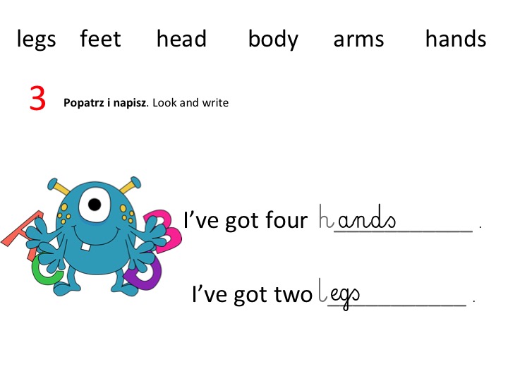 Niemal wszystkie dzieci zadawały pytania zaczynające się od „A jak się mówi …” po czym wyliczały „A jak się mówi łuski / kolce /skrzydła?”, już nie wspominając o bardziej prozaicznych słowach, takich jak: „oczy, „szyja” czy „dwanaście”. Trochę tej ciekawości zaspokoiłam – jak widać, już na karcie pracy, jest kilka nowych słówek – płetwy, ogon, pazury, mały, duży, długi, krótki. Ale nie chciałam przesadzić i odpowiadać na każde pytanie „A jak się mówi…”, bo dzieci miały w końcu się popisać tym, co już potrafią, a nie odkrywać cały ogromu słówek, których jeszcze nie znają. Little by little, step by step… Cierpliwości.