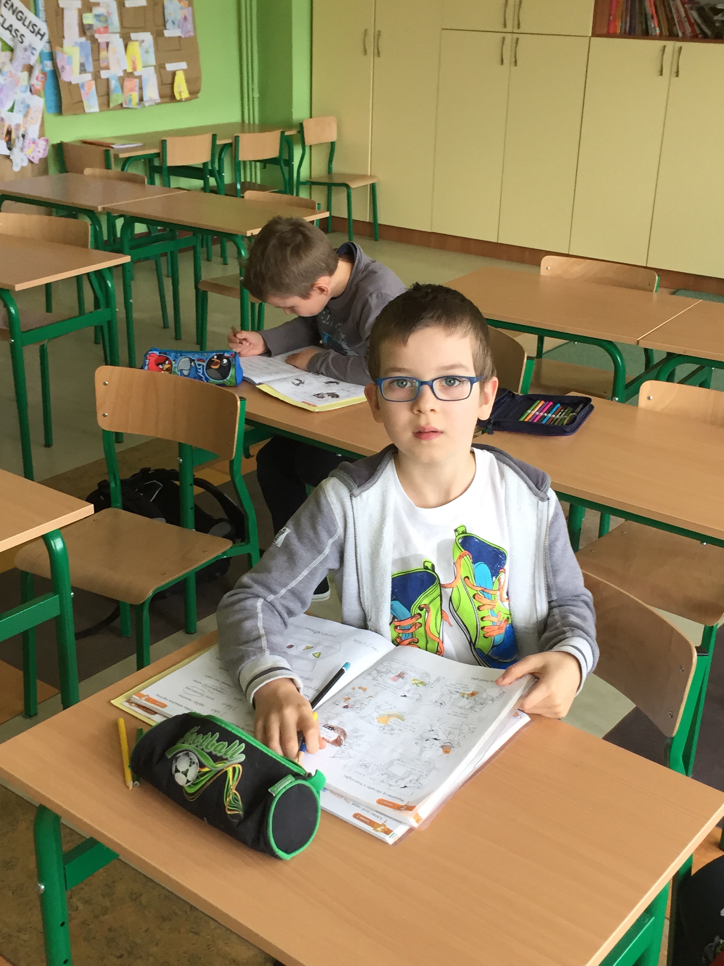 Inne zaś pakują się i śpiewają Tidy up song dosłownie po każdym ćwiczeniu, nawet w 10 minucie lekcji. Zawsze mnie to bawi, ale dzisiaj i ja miałam ochotę jak najszybciej „zwiewać z budy”, ponieważ lekcja toczyła się równolegle do innych (licznych i męczących) wydarzeń: co i rusz ktoś wchodził do klasy i o coś pytał; dzieci w czasie lekcji dwójkami wychodziły na fluoryzację zębów; te co akurat nie szły co chwilę przerywały mi w pół zdania i pytały, kiedy ich kolej, kogoś bolała głowa, ktoś rozciął palec o kartkę i domagał się plastra… Jak tu się skupić? Jak pracować w takim (chciałoby się rzec „wariatkowie,” ale nauczycielowi nie wypada) chaosie? Nic dziwnego, że niektórzy wykorzystują na pracę … przerwę, która jak się okazuje jest najspokojniejszym fragmentem lekcji 😉