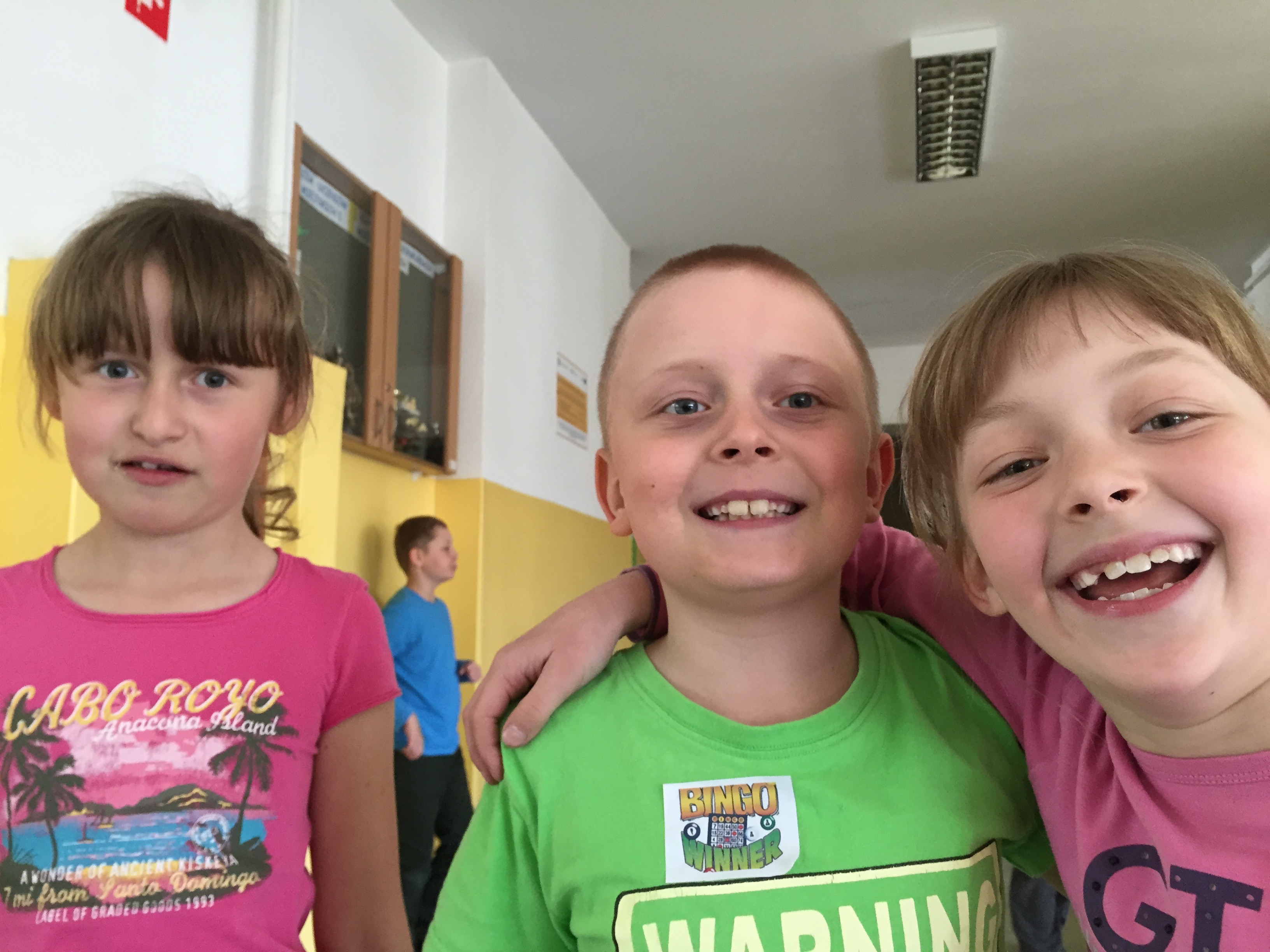 Najpierw jednak sprawdziliśmy zadanie domowe, w tym oczywiście rozegraliśmy trzy partyjki Bingo. Dzieci były trochę znudzone graniem w Bingo, więc żeby je trochę zmobilizować do uważnego słuchania, rozpoznawania słówek i ich skreślania, po pierwszej turze zwycięzca/czyni dostali naklejkę BINGO WINNER i od razu temperatura rozgrywek się podniosła. Tak cieszył się ze zwycięstwa Filip z 1a w otoczeniu fanek 😉