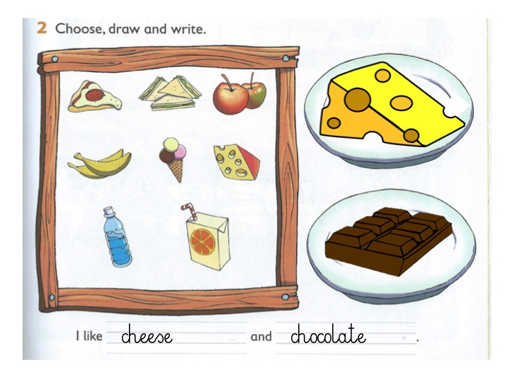 Wracamy do tego co lubimy. Mając na tablicy karty wyrazowe i obrazkowe stawiam kreski przy dwóch najbardziej lubianych przeze mnie produktach (ser i czekolada) i modeluję zdanie: I like cheese and chocolate, a na stole kładę te dwa produkty na osobnych talerzykach. Proszę jedno, a potem kolejne dziecko żeby podeszło do tablicy i powiedziało mi jakie dwie rzeczy lubią najbardziej i przy tych też stawiam kreski. W związku z tym, że na tym etapie każdy już chce przyjść do tablicy mówię im, że zanim to zrobią muszą w zadaniu 2 (podręcznik str. 59) narysować te właśnie rzeczy na talerzykach i uzupełnić zdanie I like … and … . Mój własny przykład zostawiam na tablicy.