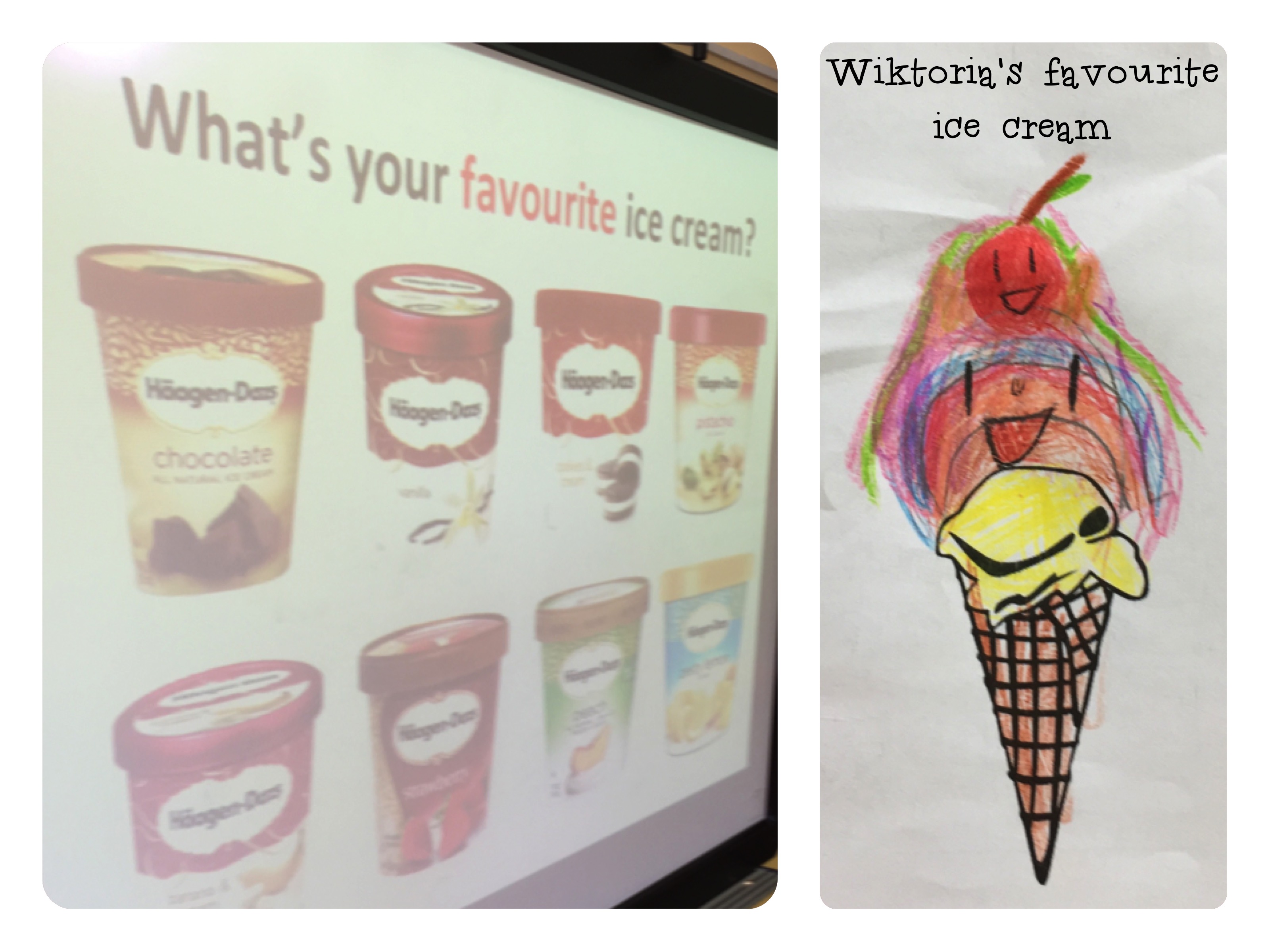 What’s your favourite ice cream? recytowaliśmy w rytmiczance (chant), a potem dzieci rysowały i odpowiadały na to samo pytanie. Na nic się nie zdało ograniczenie: Only four scoops (tylko cztery gałki)! Mam szczere wątpliwości czy drobniutka Wiktoria z 1c dałaby radę zjeść takiego wielkiego loda jakiego narysowała, no ale może znowu nie doceniam swoich uczniów 😉