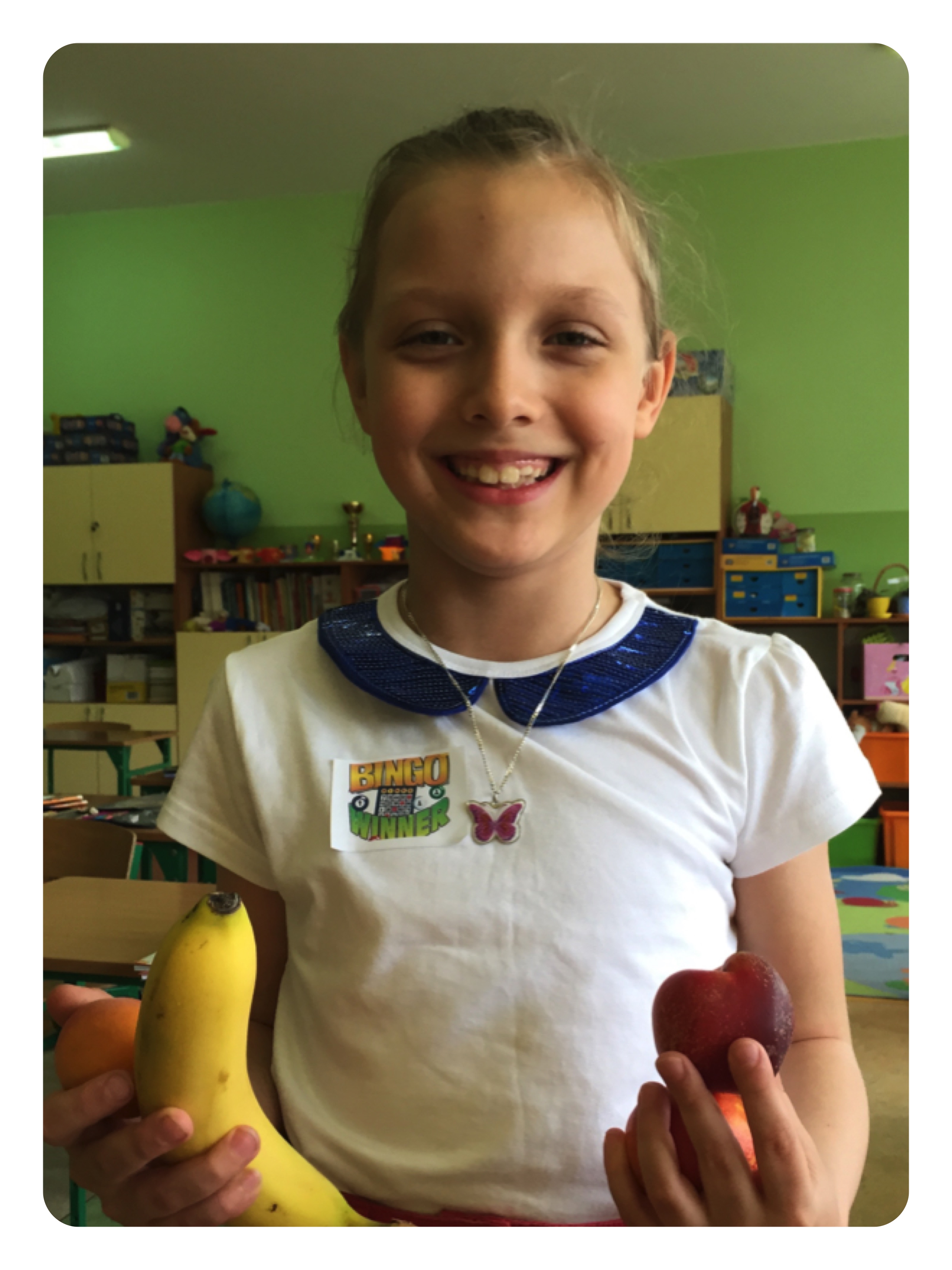 Na koniec lekcji w 1b śpiewaliśmy Happy Birthday dear Milenka i dostaliśmy po cukierku od wczorajszej solenizantki. W 1c pyszne owoce dostałam tylko ja, bo główne uroczystości były przewidziane później. Thanks a lot, Caroline!!!