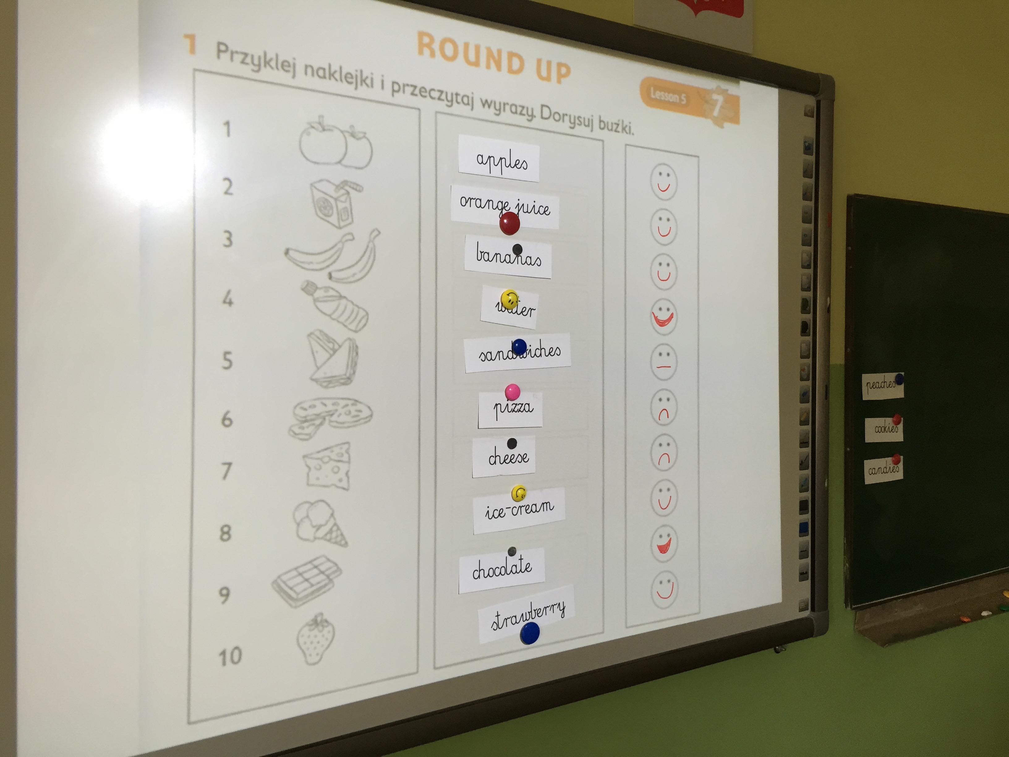 Oczywiście nie zabrakło też pytania Do you like…? Bo to, co jedne dzieci uwielbiają, inne nie aż tak bardzo więc pojawiły się struktury typu I like Kinder chocolate but not this one. Będąc przy temacie I like, I don’t like zrobiliśmy też ostatnie ćwiczenie z zeszytu ćwiczeń, najpierw wspólnie na tablicy, a potem indywidualnie wyklejając naklejki w ćwiczeniach (str. 49).