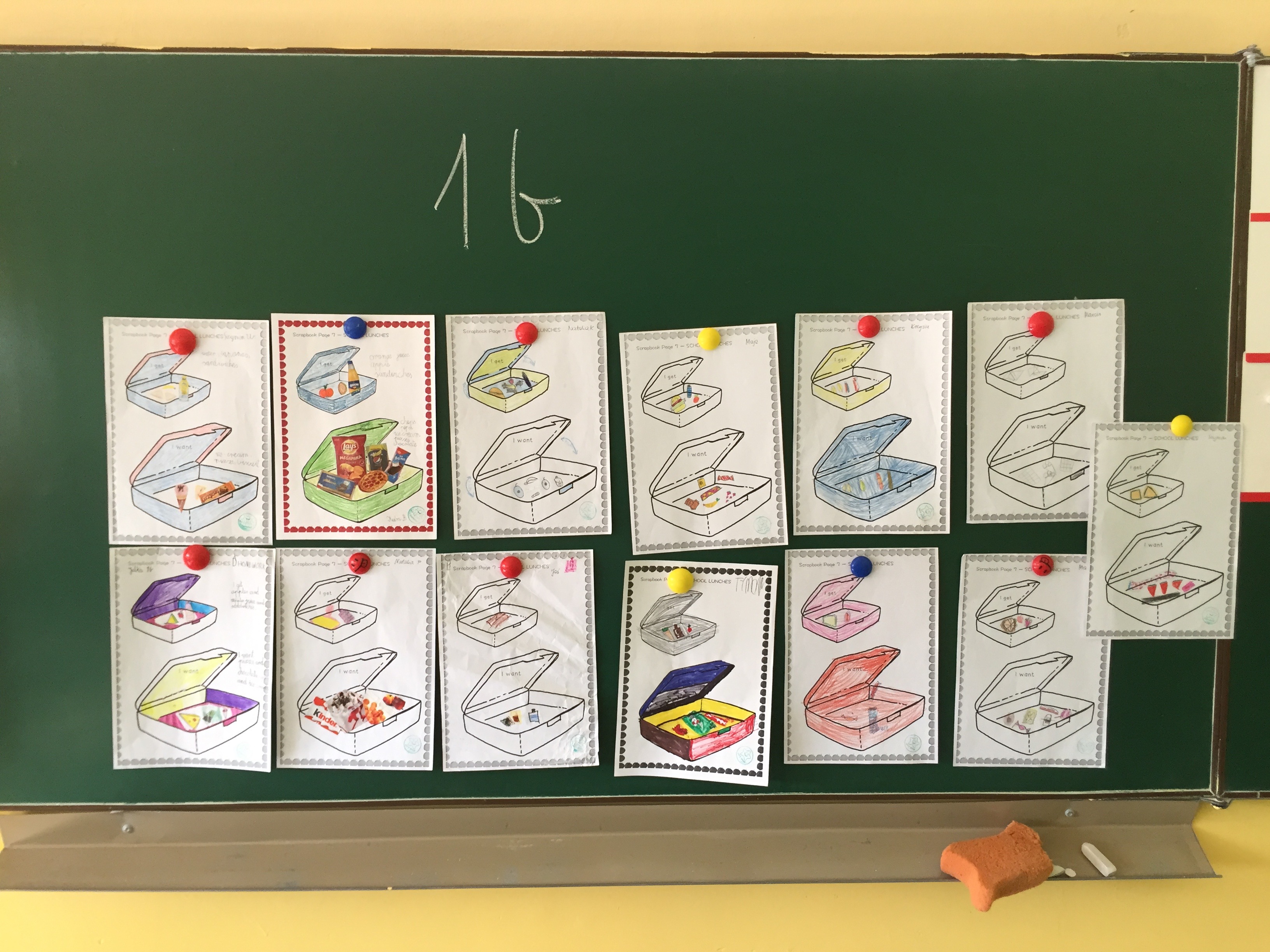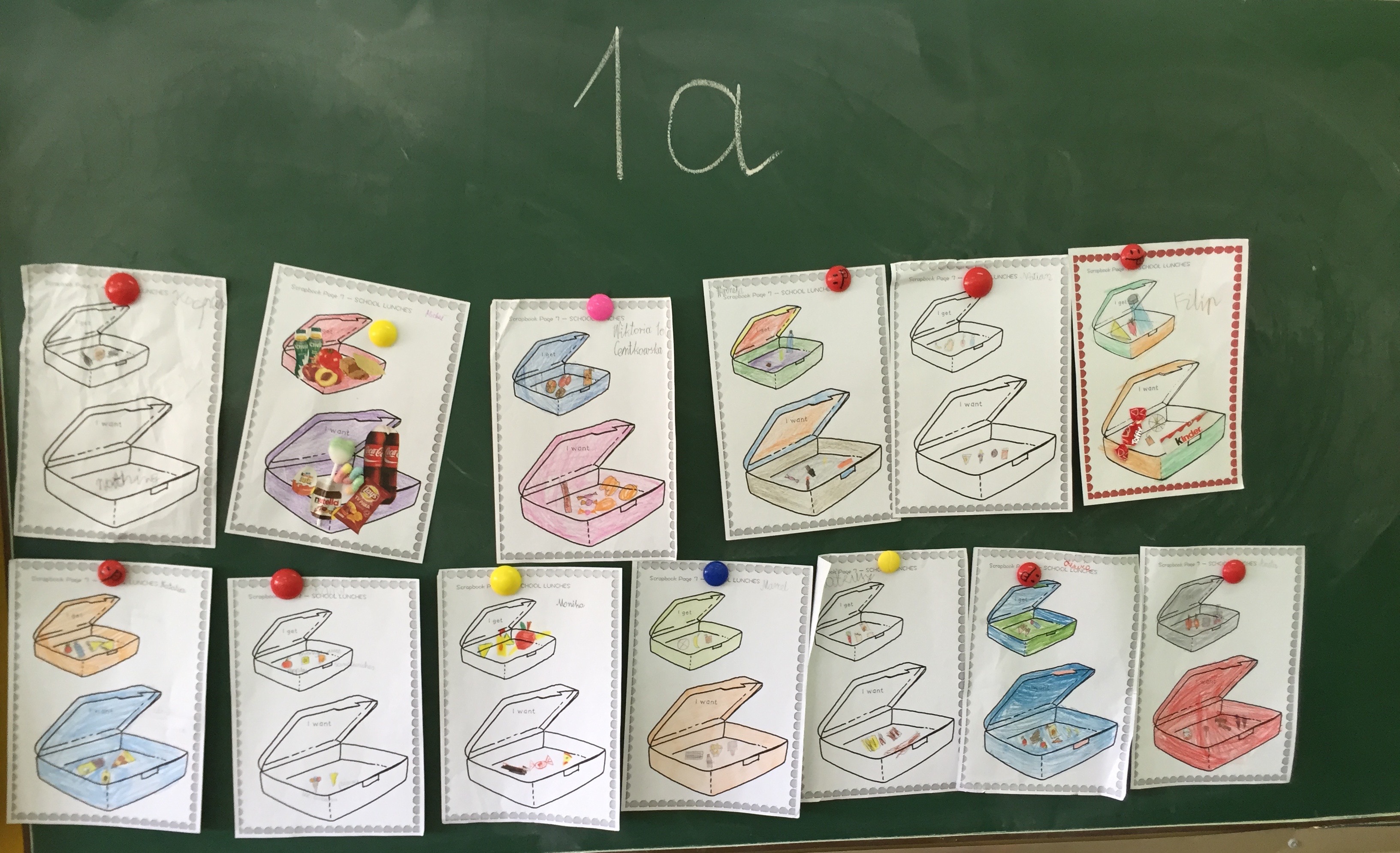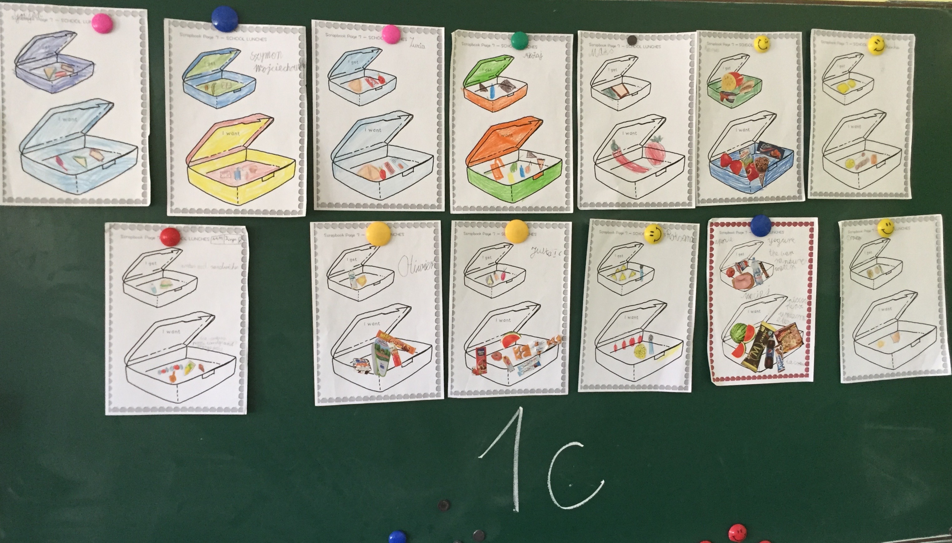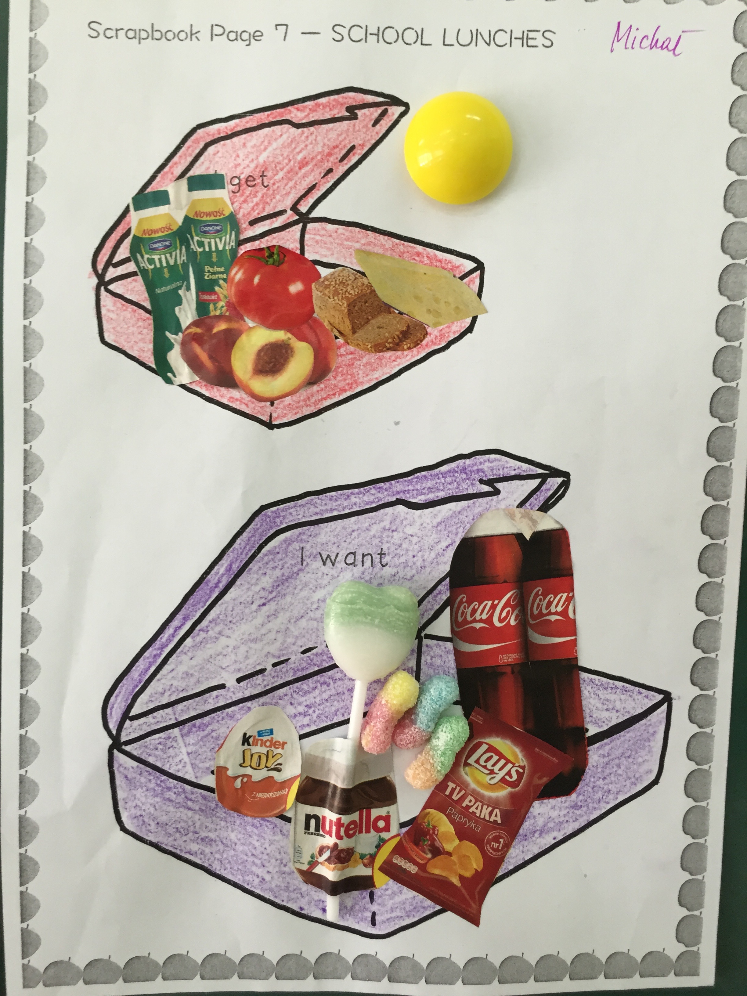 Zaraz po piosence powitalnej przeszliśmy do oglądania naszych skrapbukowych dzieł (Scrapbook Album), bo dzieci naprawdę nie mogły się doczekać żeby się nimi pochwalić. Wszyscy byliśmy ciekawi ile rzeczy udało się każdemu wsadzić do magicznej śniadaniówki (lunch box) z samymi zakazanymi rzeczami 😉 : crisps, chips, chocolate bars, lollipops, candy bars … słowem: lots, lots of sweets! A na słono oczywiście nie zabrakło pizzy, frytek (chips, French fries) and chipsów (crisps) wszelakiej maści. Dzieci bardzo twórczo podeszły do tematu i zrobiliśmy piękną galerię ich prac. Szkoda tylko, że jak zwykle sporo z nich „zapomniało zrobić / przynieść zadanie domowe”. Viola! Proszę podziwiać. Galerię otwiera praca Michała z 1a, absolutny „hicior”, jak orzekły dzieci.