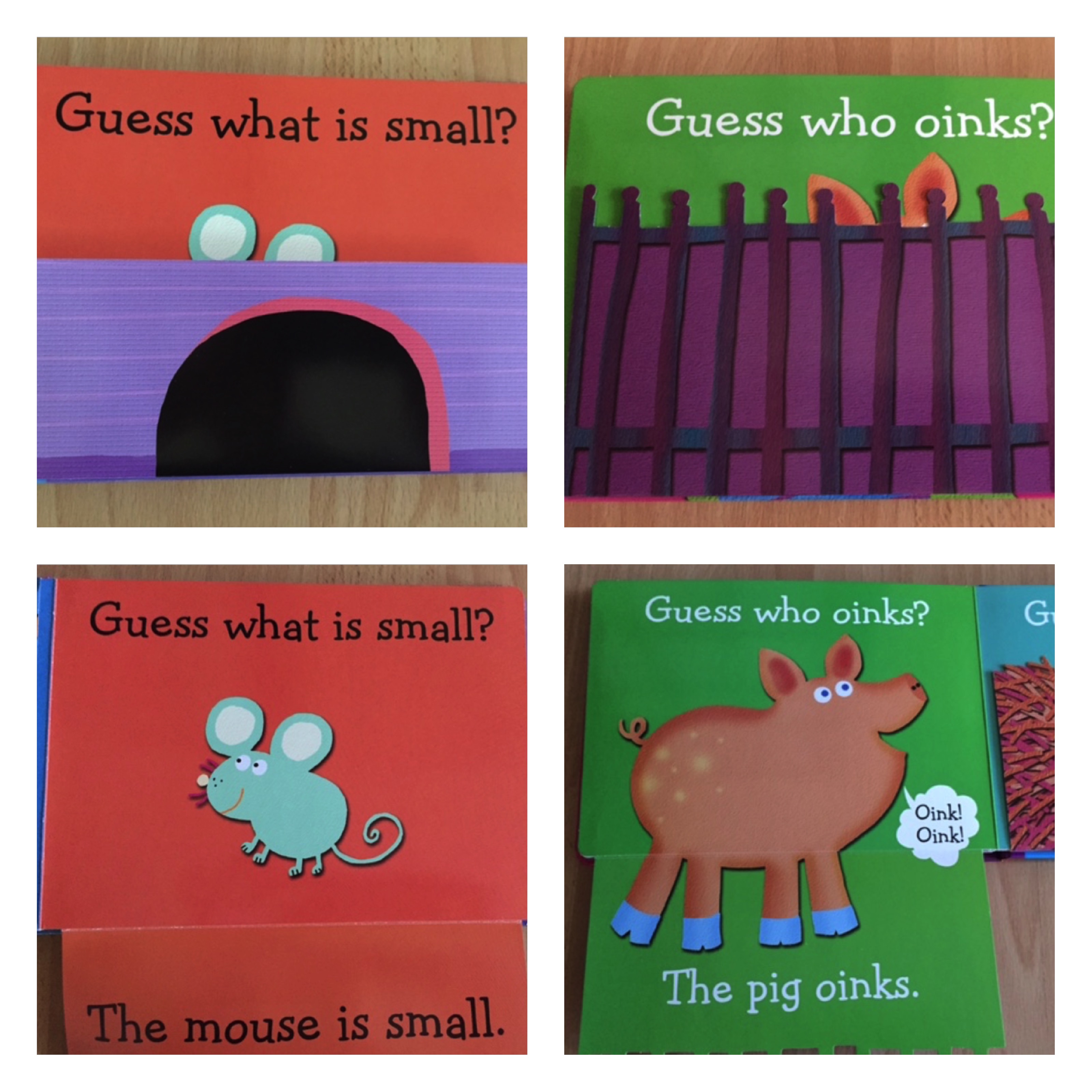 Mamy tu Czerwonego Kapturka z wysuwanymi wtrąceniami do historyjki. Zwierzęce mamy i ich dzieci w formie wyjmowanych ze strony obrazków. No i dwie flip-the-flap books – pod uchylną klapką znajduje się odpowiedź na kluczowe pytanie.