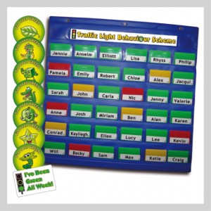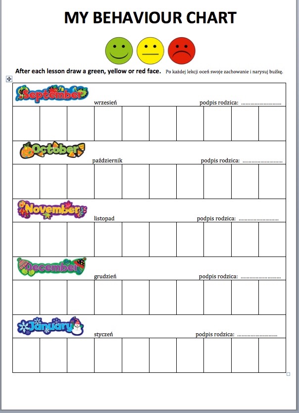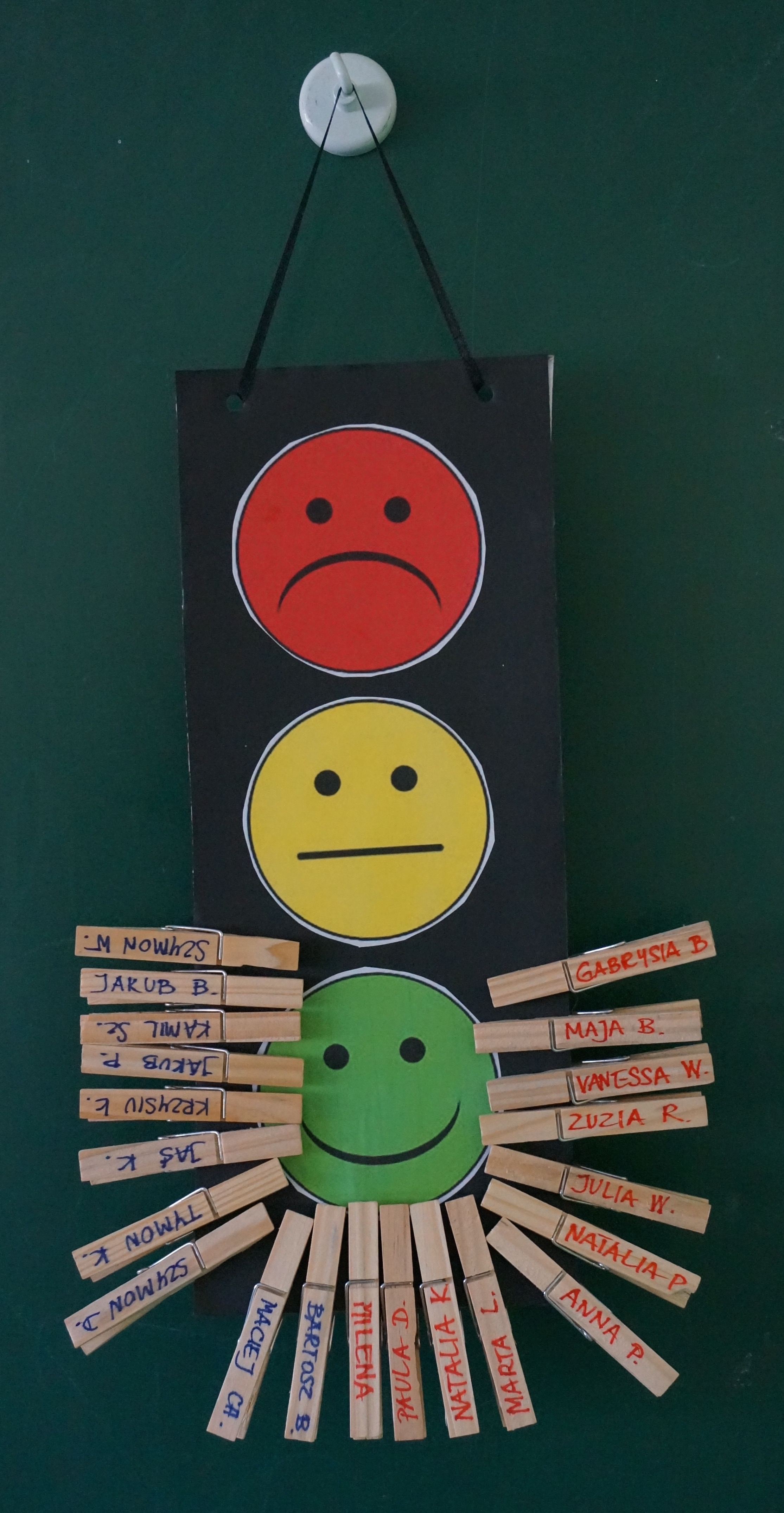Po wielu miesiącach namysłu zdecydowałam się w drugich klasach wprowadzić system oceny zachowania Traffic Light Behaviour Scheme, zwany też Stoplights System, niezwykle popularny w USA i z tego co widzę w tej czy innej formie zaczynający być popularny i w Polsce. Nazwa Traffic Light System wzięła się z analogii do ruchu drogowego. Kierowcy na zielonym jadą, żółte ich ostrzega o niebezpieczeństwie, a czerwone sygnalizuje STOP! Zatrzymaj się. Podobnie w klasie zielony kolor informuje dziecko: „przestrzegasz reguł, robisz to, co do ciebie należy, jesteś miły dla innych”, itd., czerwone jest karą za złamanie zasad, zaś żółte jest przestrogą „robisz źle, popraw się”. Ogólna zasada jest taka, że wszystkie dzieci zaczynają dzień/lekcję „na zielonym” i tylko od nich (ich zachowania) zależy jak ten dzień skończą. Nie dostają od razu kary – w Stanach czerwone światło = notka do rodziców, timeout, brak przerwy rekreacyjnej albo dodatkowe zadanie, – ale liczymy, że „żółta kartka” je zmobilizuje i się poprawią. W zależności od przyjętej wersji to albo nauczyciel zaznacza zmianę pozycji z zielonej na żółtą/czerwoną (np. zapisuje imię dziecka na tablicy, przemieszcza karteczki z imionami dzieci, ludziki, magnesy, klamerki, obok pola z kolorem żółtym lub czerwonym) albo robi to samo dziecko. Tablica z wynikami (Behaviour chart) wisi w sali i cały dzień widzą je inni uczniowie w klasie, albo, często, na korytarzu, gdzie mogą je wszyscy zobaczyć: inne dzieci, personel przedszkola lub szkoły oraz rodzice. Poniżej różne wersje tego samego systemu.