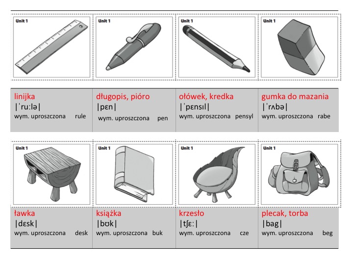 By uruchomić pamięć mechaniczną pokazywaliśmy przedmioty w klasie, pokazywaliśmy je na kartach obrazkowych, w podręczniku, powtarzaliśmy nazwy przedmiotów za nagraniem, potem za nauczycielem, na różne sposoby: cicho, głośno, wolno, szybko, wesoło, smutno, itd. Na koniec nauczyliśmy się nowej piosenki Here’s my pen, w której pojawiają się wszystkie przybory szkolne (nie ma w niej bag, chair i desk). By ułatwić sobie zapamiętanie słów piosenki dzieci otrzymały obrazki z kluczowym słownictwem, to właśnie je pokazują na filmiku: