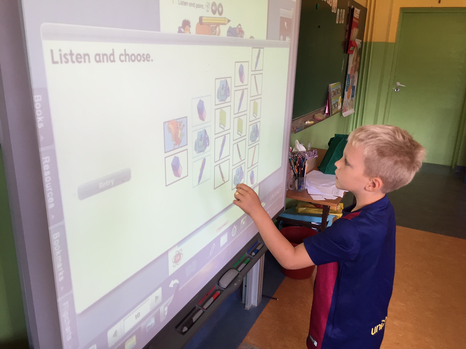 Dzieci najpierw słuchają wypowiadanych na nagraniu słów, a na obrazku (podobnym do tego w podręczniku na str. 8, Squirrrel znowu śpi na lekcji!!!) wypowiadane słowo jest obwiedzione kwadratem.