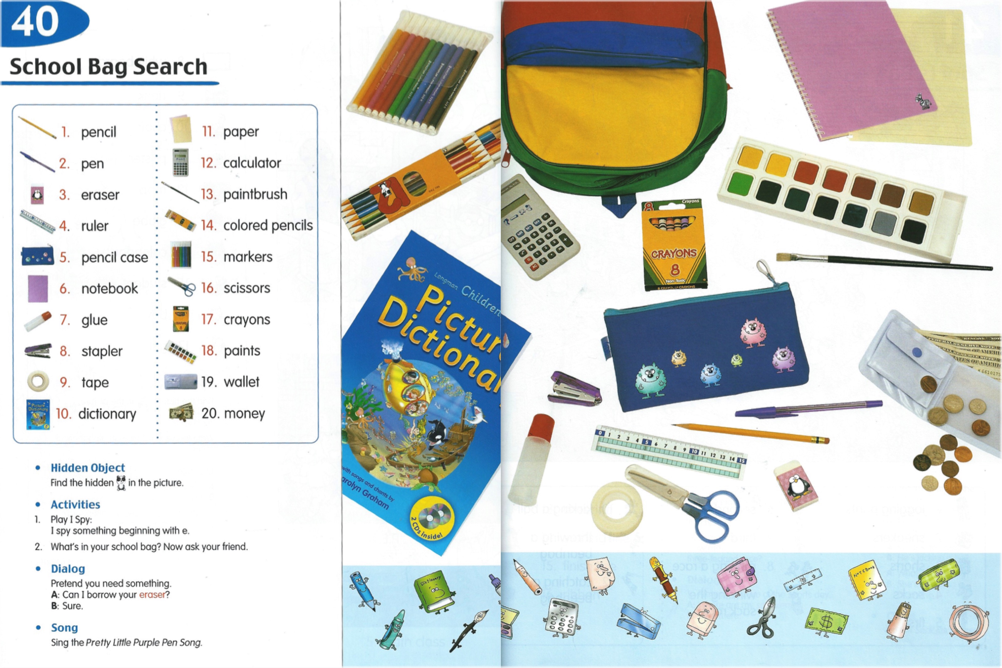 W rozdziale 1 jak widać są to podstawowe przybory szkolne (książka, ołówek, linijka, gumka, piórnik, plecak/torba szkolna) oraz wyposażenie sali lekcyjnej (ławka, krzesło), choć oczywiście na lekcji ze względu na liczne aktywności plastyczne pojawią się i nożyczki (scissors), klej (glue) oraz stół (table). Jeśli chodzi o gramatykę w rozdziale 1 to przez kilka lekcji w kółko pytamy What is it? (Co to jest?) i odpowiadamy It’s … (a book), potem zaś dodamy do tego dwa przyimki on (na) oraz in ( w ), np. The book is on the desk (Książka jest na ławce) oraz polecenie Put your … (pen in the bag) (Włóż długopis do torby), choć oczywiście masę innych konstrukcji wprowadzam do biernego odsłuchu.