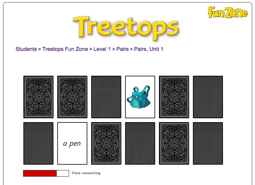 Kolejna gra dostępna na Treetops Funzone to Pairs czyli stare poczciwe Memory (dobieranie w pary). Klikamy w dwie dowolne karty, które się odsłaniają. Połowa kart jest z obrazkami, druga połowa z napisem, mamy zatem świetną ekspozycję na wersję pisaną poznawanych wyrazów, co przyda nam się później. Przy odsłanianiu się kart słyszymy wersję mówioną. Jeśli obrazek-wyraz nie stanowią pary po chwili zasłaniają się i możemy kliknąć w kolejną parę. Oczywiście chodzi o to, by zapamiętać gdzie leżą konkretne wyrazy, by klikanie zredukować do minimum, no i zmieścić się w czasie, który jak widać „ucieka”.