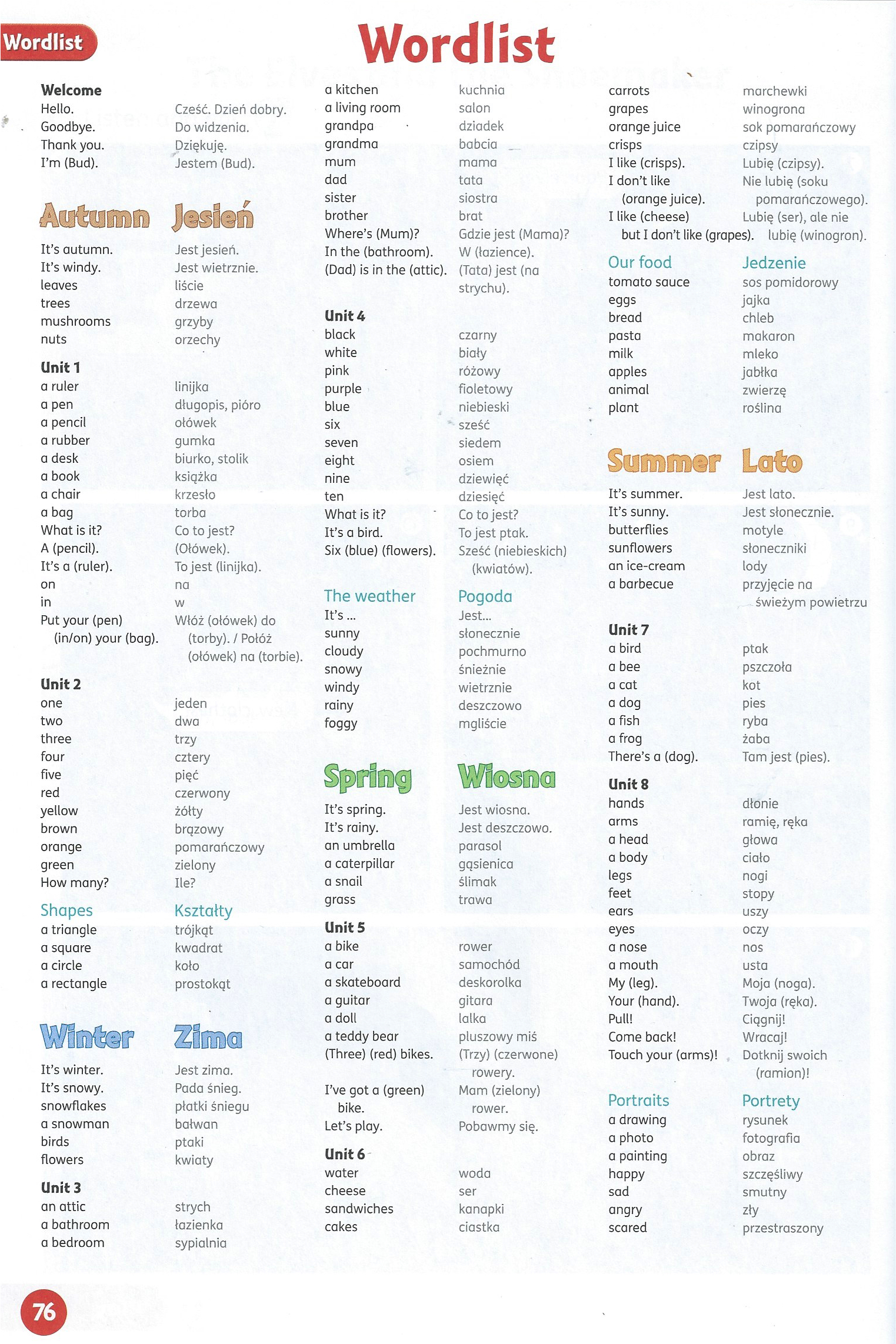 Lista „przerabianych” na lekcjach słówek jest zamieszczona na końcu podręcznika. To jest to bazowe minimum, którego uczymy się i utrwalamy na lekcjach, a potem kontrolujemy na sprawdzianach. Na liście umieszczone są też podstawowe konstrukcje gramatyczne, które pragniemy, by dzieci rozumiały ze słuchu (umiejętności receptywne), a potem używały w mowie (umiejętności produktywne).