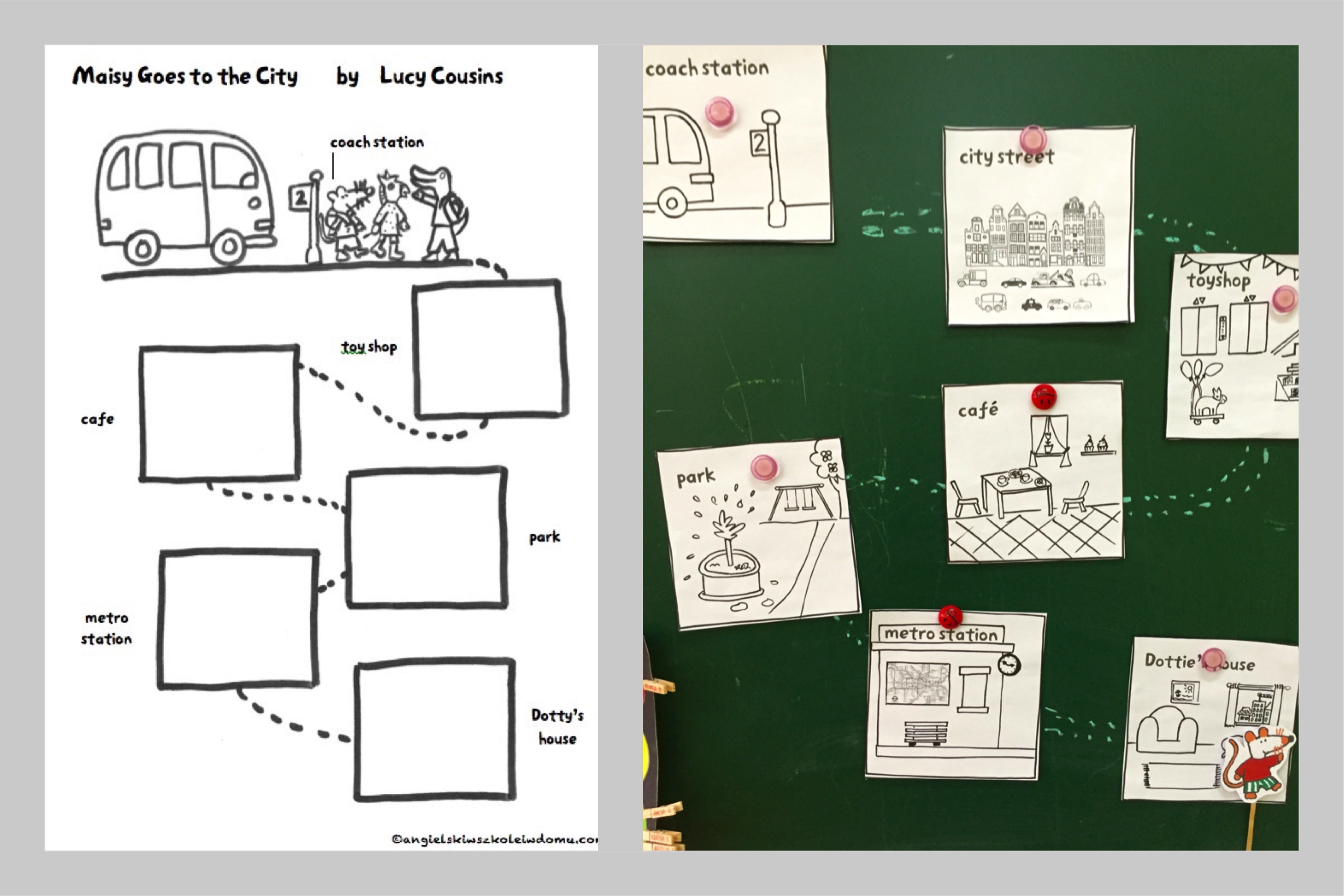 PS. Drodzy Nauczyciele i Rodzice! Kto ma ochotę wykorzystać Maisy goes to the city na swojej lekcji lub w pracy z dzieckiem w domu, to karty do pobrania są TU–> Maisy Goes to the City_worksheet i TU–> Maisycity_flasharcards_1. Proszę o komentarz jeśli się spodobały. [Dear teachers! You are welcome to use my materials for Lucy Cousin’s Maisy goes to the city storybook. Please leave a comment if you and your students liked them.] Sylwia