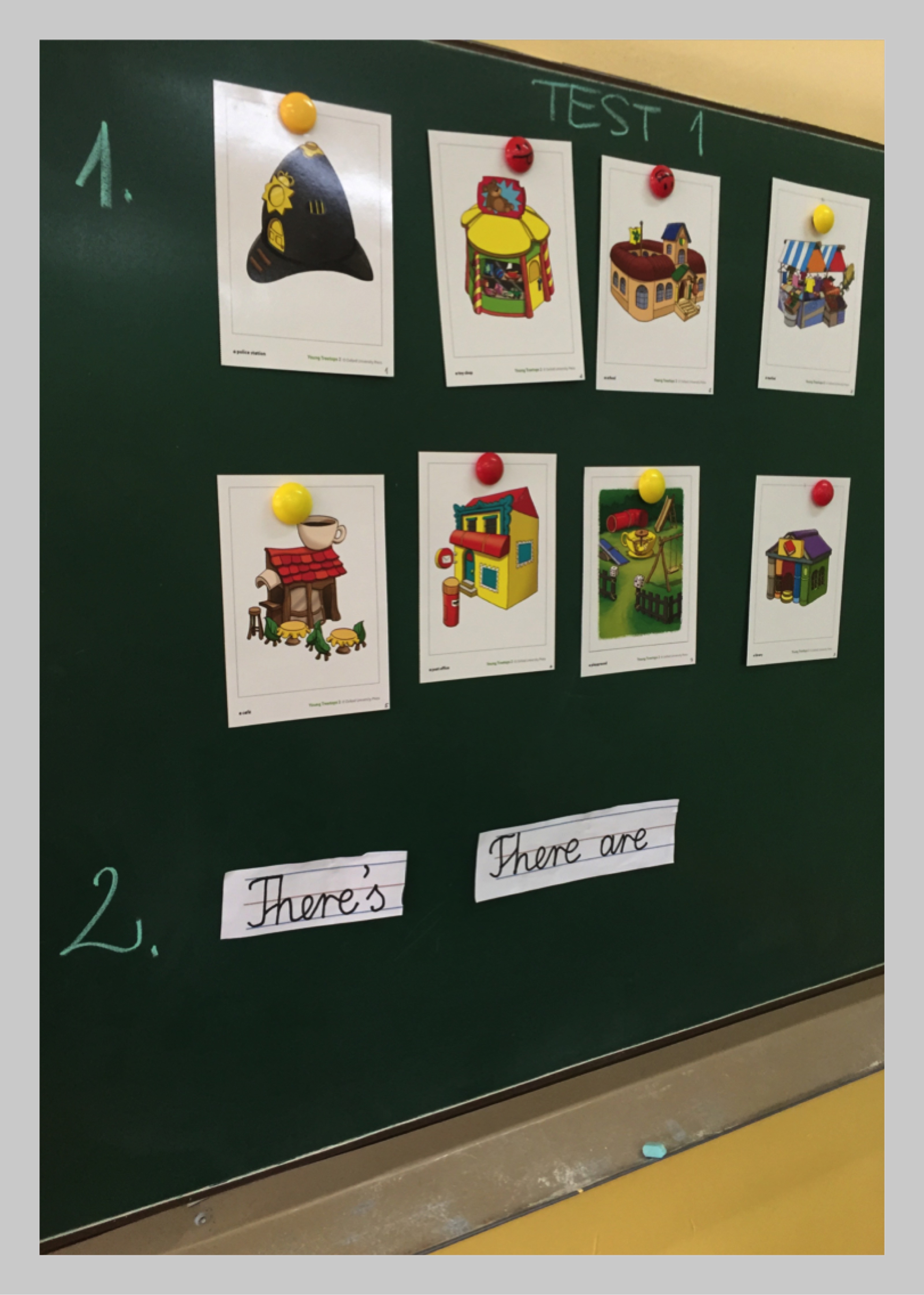 Drugie zadanie było trochę trudniejsze – należało we fragmenty zdań (np. ….. three houses.) wpisać There’s lub There are. Zasadę tuż przed testem razem powtórzyliśmy. Dwa napisy na tablicy powinny dzieciom pomóc skojarzyć te kilka ćwiczeń, które zrobiliśmy. I cóż? Nic. Jeśli dzieci przyswoiły sobie nową strukturę, to te pięć zdań robiły w minutę. Jak jeszcze nie, to siedziały dziesięć kolejnych i mimo mojej wydatnej pomocy i tak miały problem.
