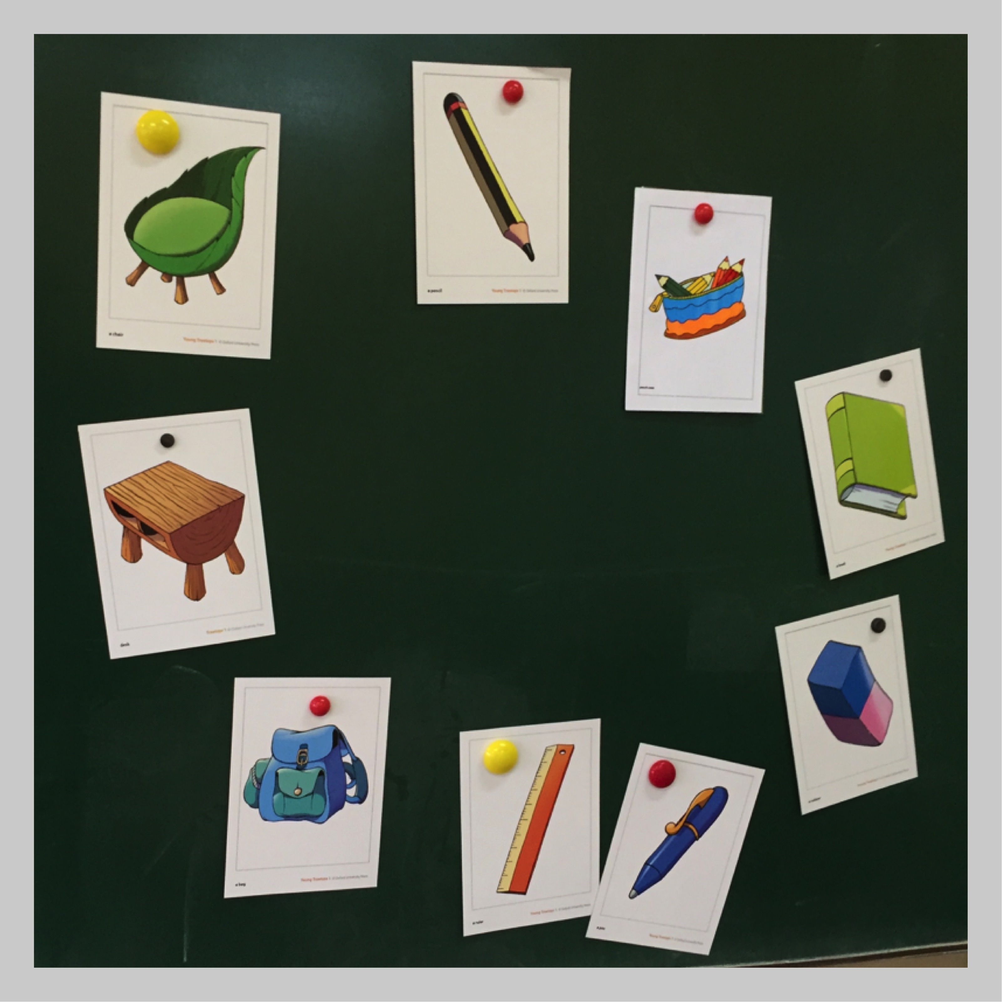 Potem właśnie przy pomocy miniflashcards (małych kart obrazkowych) zagraliśmy sobie w Put in/put on. Najpierw przypomniałam dzieciom te dwa przyimki przy pomocy dwóch rysunków zawieszonych na tablicy – plecaka i krzesła. Po kolei wyjmowałam z woreczka kolejne przedmioty szkolne i mówiąc Put the pencil in the bag, Put the pen on the chair wkładałam lub kładłam przedmioty w odpowiednim miejscu. Dzieci siedząc na dywanie nie widzą, że przedmioty mają z tyłu przylepioną masę mocującą (tack), więc mogę je przylepiać do rysunku. Plecak zaś ma zrobione kieszenie, więc mogę też do niego wkładać rzeczy. Prosty pomysł, a ja cieszę się „jak dziecko”, gdy rok w rok moi mali uczniowie dopytują się: „A jak pani to robi?” It’s a secret” albo „It’s magic” – odpowiadam i zawsze jedno z odważnych (lub tych mniej „grzecznych”, jak kto woli) podchodzi do tablicy sprawdzić co to za „magia” 😃. Czasami też, tak jak w zeszłym roku, używam mojego plecaczka z kartonowymi modelami przedmiotów, które wkładam i nakładam na siebie, albo wkładam do woreczka i bawię się w co jest w worku („What’s in the bag?”).