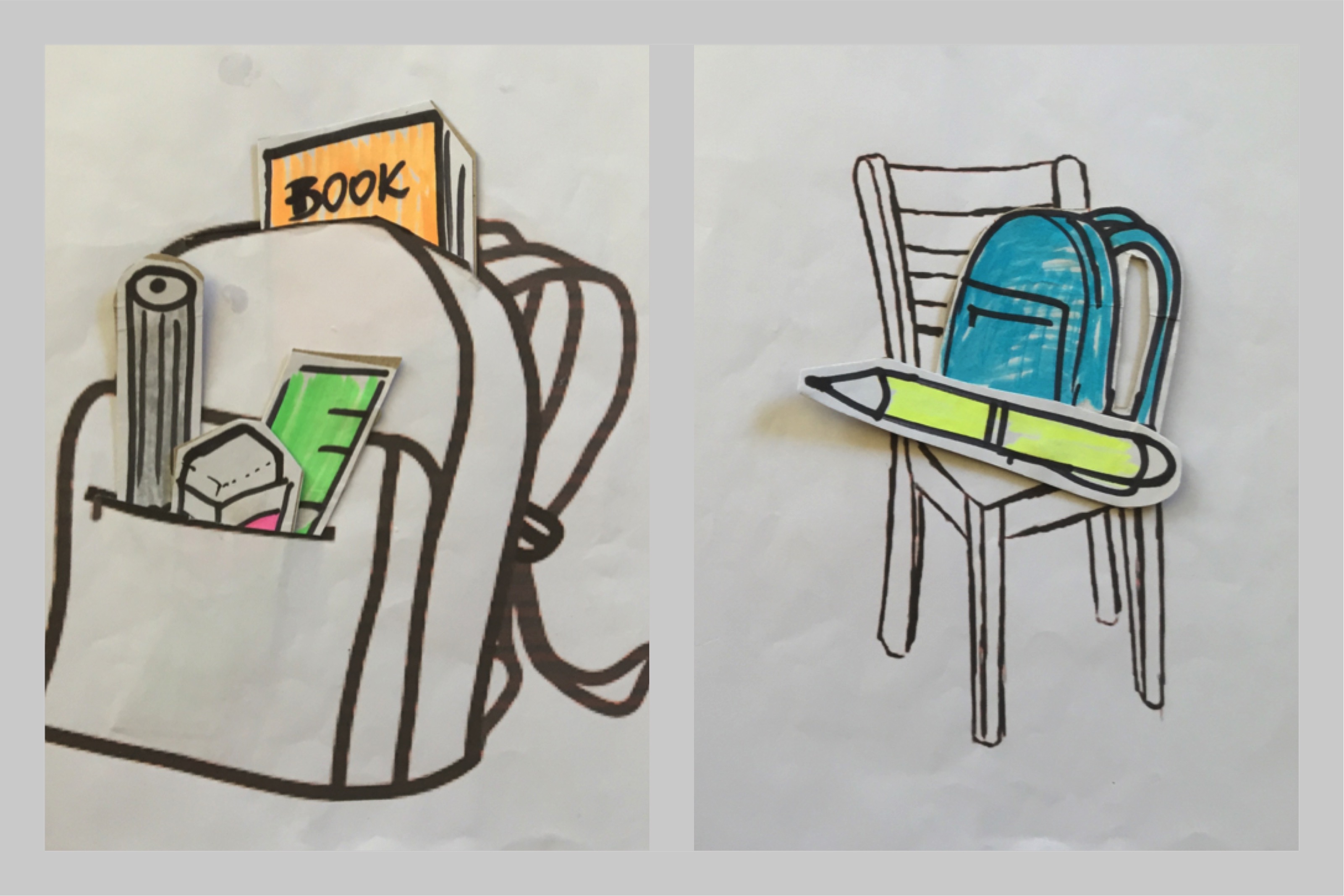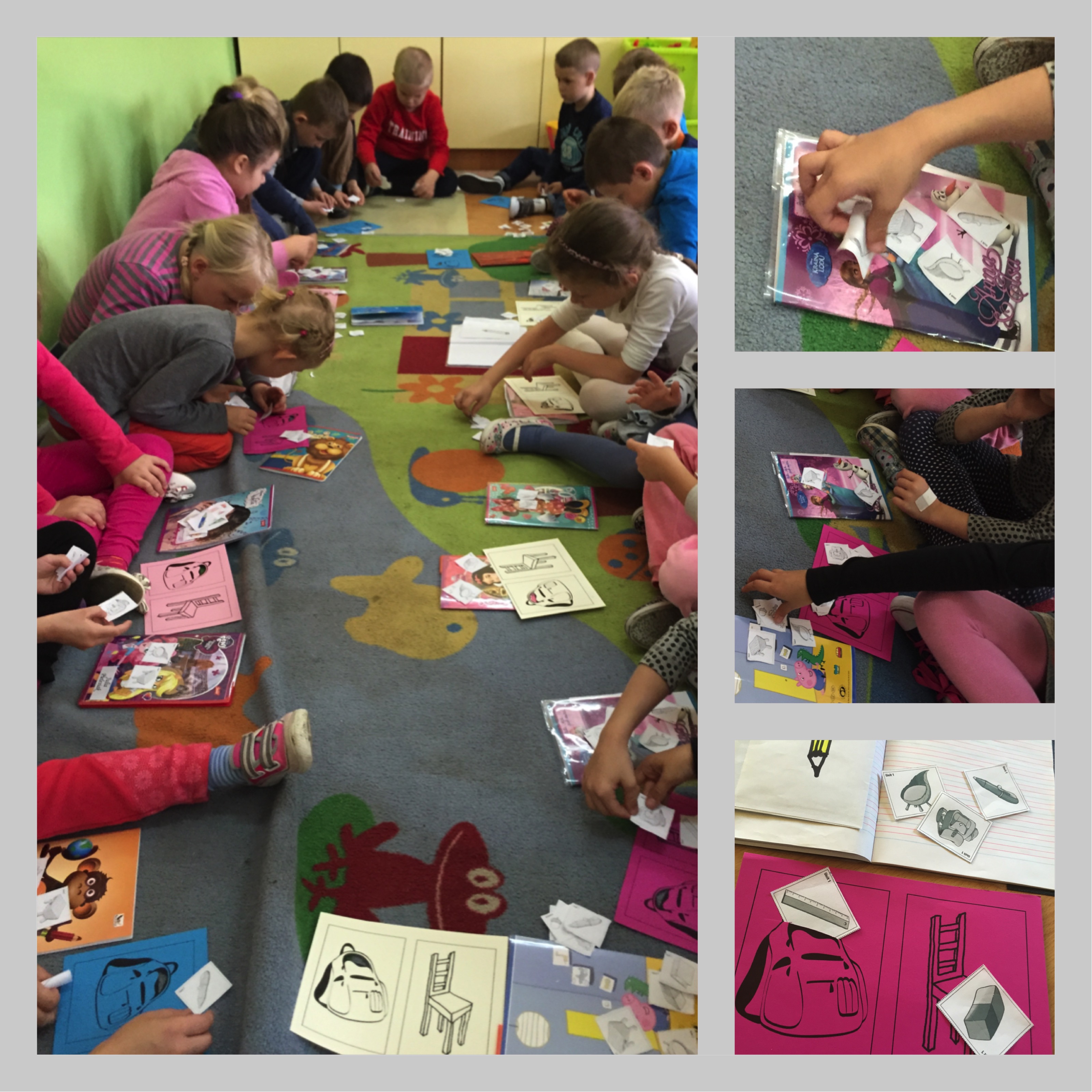 Zadanie z podręcznika (str. 12) zmieniłam, bo po pierwsze dzieci często nie mają w piórniku długopisu (piszą ołówkiem), więc nie mogą go kłaść na rysunek, a po drugie w dobie „wieloletniości” trzymam ołówki i długopisy z dala od podręcznika. Rozdałam dzieciom duże obrazki z krzesłem i plecakiem (ten również miał wyciętą kieszeń) i najpierw ja mówiłam dzieciom co wkładać „na” i „do” (dwójka dzieci do jednego plecaka/krzesła), a po kilkunastu powtórzeniach dzieci wydawały sobie polecenia w parach. To pierwsza nasza praca w parach, więc nie oczekiwałam cudu, ale poszło zadziwiająco dobrze. Może dlatego, że wyciągnęłam wnioski z zeszłego roku i dzieci nie siedziały w ławkach (za dużo rozpraszających rzeczy) tylko na dywanie, parami blisko siebie.