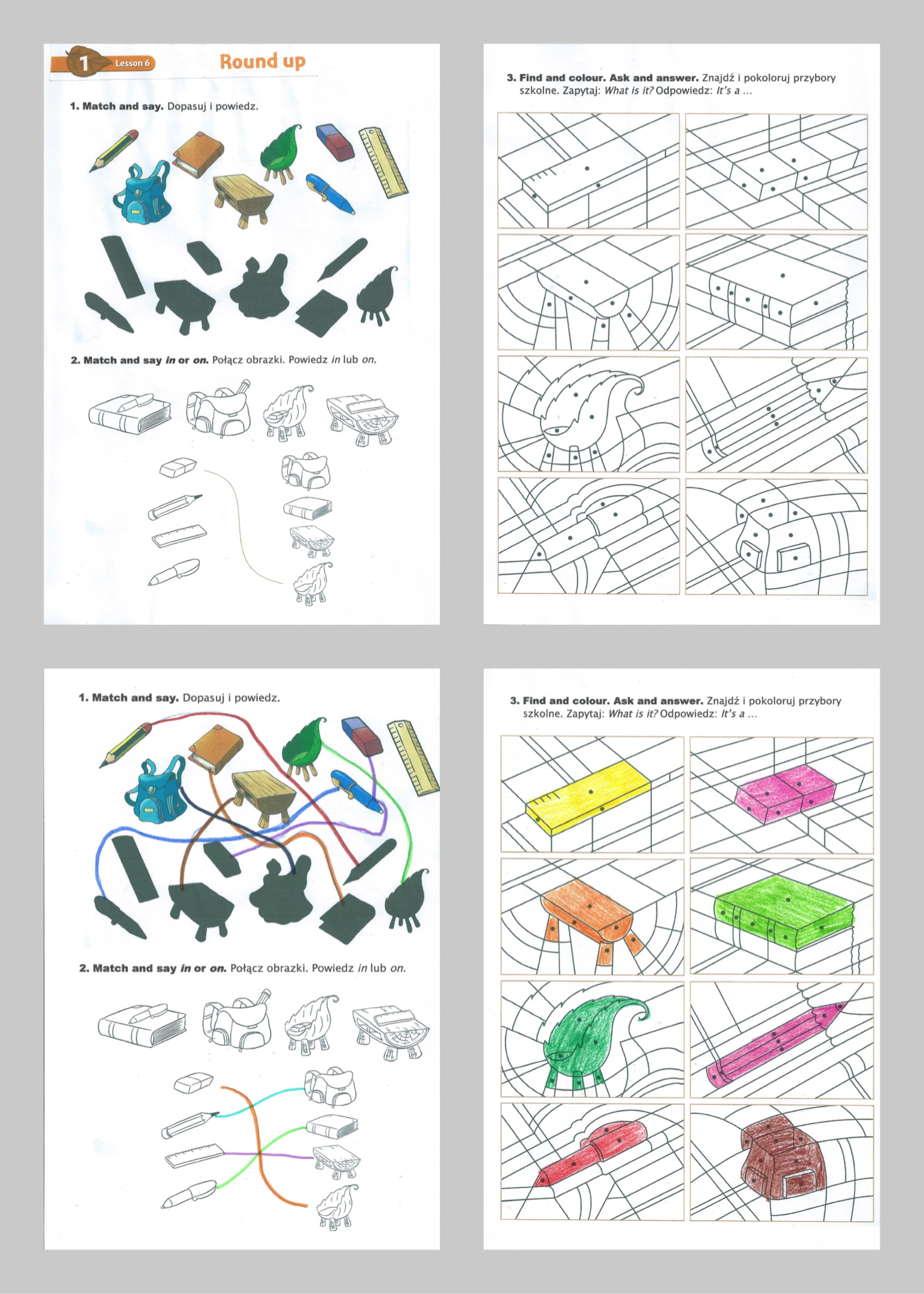 Na drugiej w tym tygodniu lekcji po zwyczajowym powitaniu, pośpiewaniu piosenek i powtórce, dzieci dostały trzy zadania na karcie pracy. Powoli i dokładnie, ale krótko powiedziałam dzieciom co w każdym zadaniu należy zrobić, pokazałam przez kilka sekund z daleka modelową „rozwiązaną” kartę pracy, żeby dzieci miały jakie takie rozeznanie dokąd zmierzają oraz by zredukować liczbę pytań w stylu „A dowolnym kolorem?” „A łączyć ołówkiem?” „A gdzie?” „A od czego zacząć?”. Te pytania i tak się pojawią, niektóre dzieci potrzebują spersonalizowanej odpowiedzi, takiej „tylko dla siebie”.