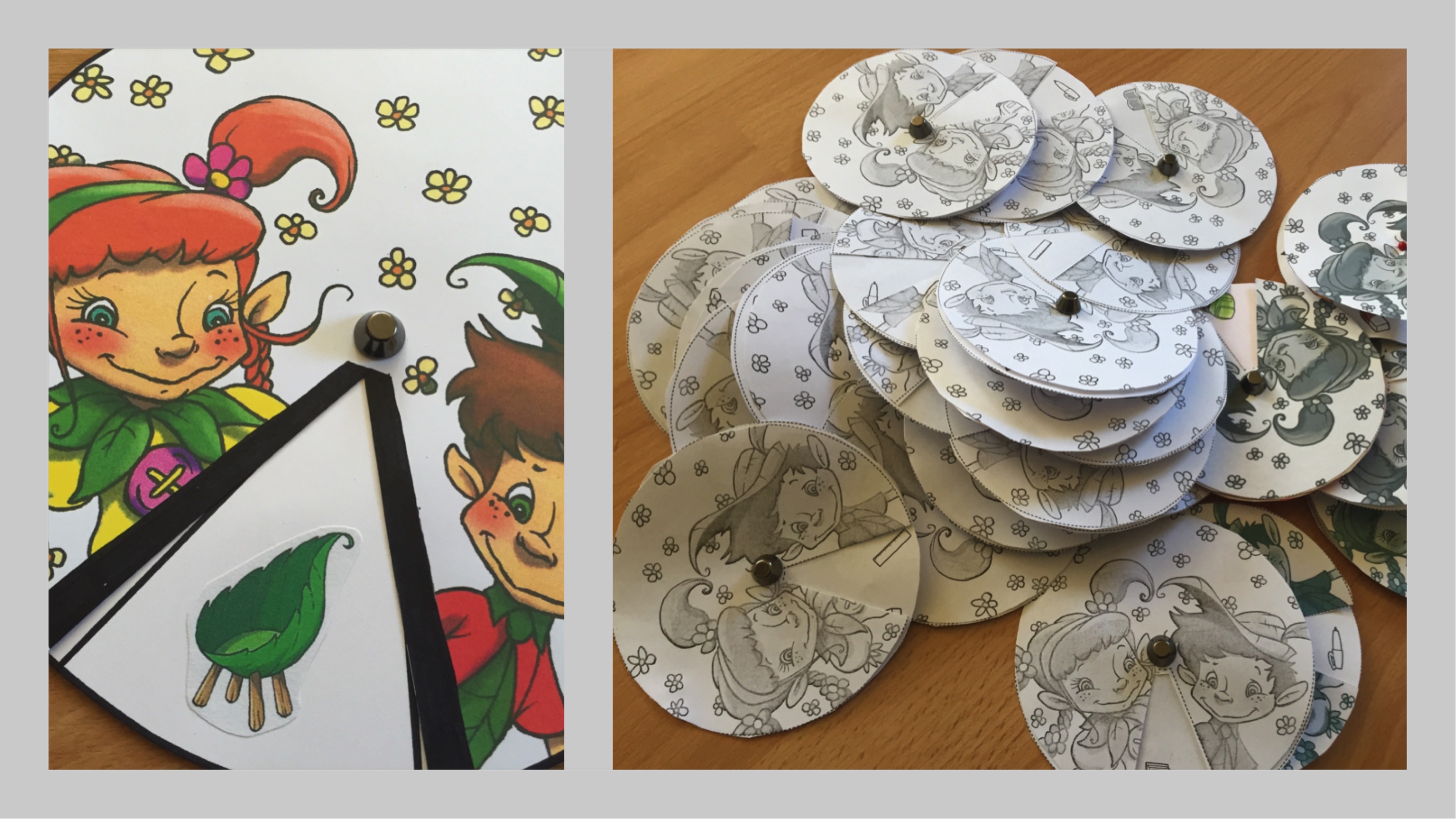 Drodzy Rodzice, kto ma chęć może wykonać takie koło fortuny razem z dzieckiem – już samo wykonanie rysunków prowokuje do ich nazywania po angielsku, a oto chodzi w powtórce materiału przed testem. To tylko dwa kółka z papieru nabite szpilką na korek (lub spięte, jak u mnie, specjalnym rozginanym ćwiekiem na nóżce).
