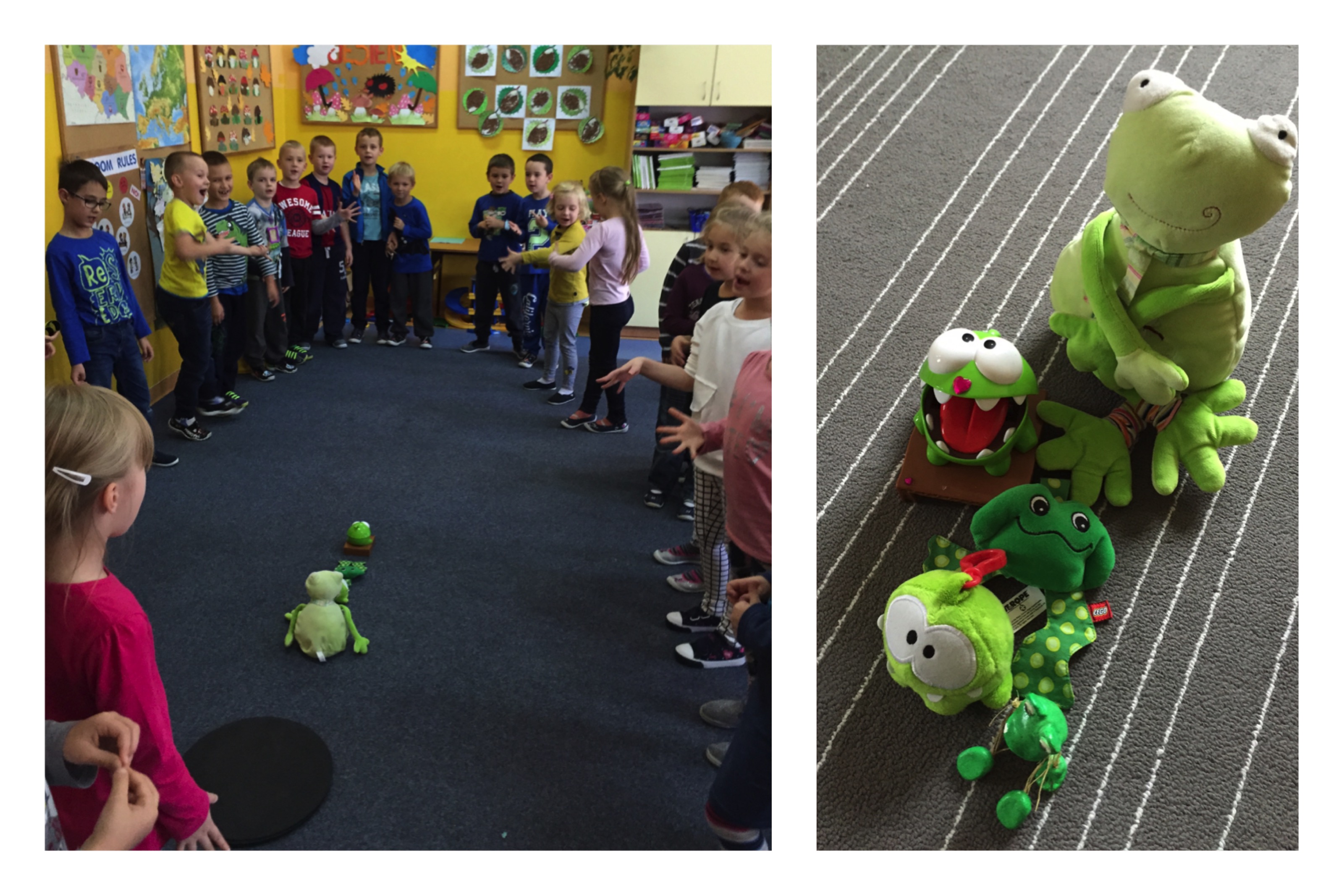 A zatem: liczymy żaby wyjmowane przeze mnie z worka. Na ich widok dzieci przejawiają ten sam co zawsze entuzjazm: „Ojej, prosze pani jaki fajny! „O, a ja gram w tą grę” (Cut the rope z żabą uwielbiająca cukierki). Nowe słowa + emocje = zapamiętywanie, czyż nie?