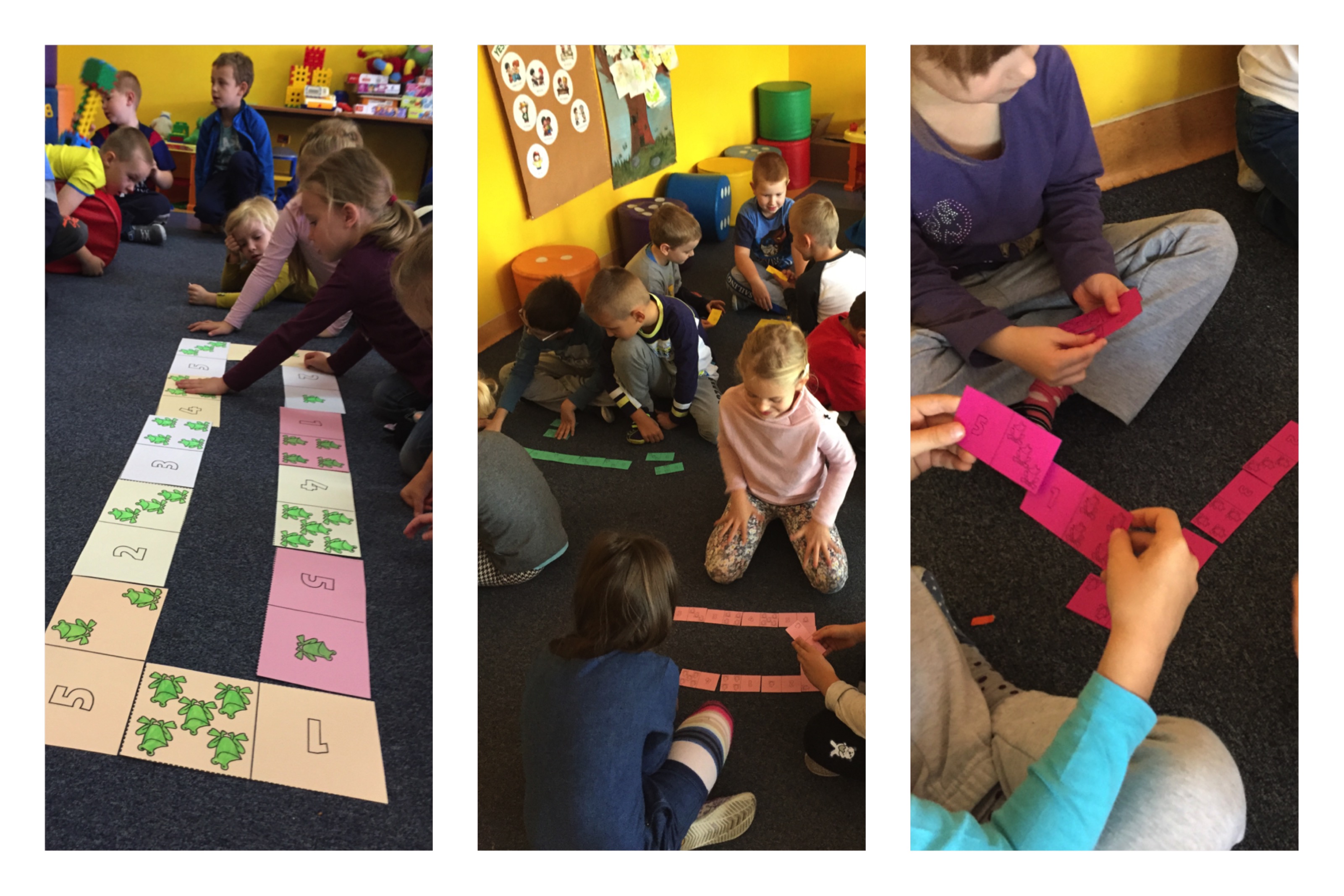 Przygotowując się do historyjki liczymy też żaby na planszach domina i porównujemy je z cyfrą na planszy obok zastanawiając się czy możemy ją dołożyć do tej, która leży na dywanie. W ten sposób uczę/przypominam dzieciom jak się gra w domino: na jednej lekcji gramy całą klasą w wielką podłogową wersję, a na następnej dzielę dzieci na trzyosobowe zespoły i grają w grupach. Oszczędzam w ten sposób czas na tłumaczenie zasad, no i nie muszę przechodzić na polski. Trzy rundki grania wystarczają żeby wszyscy powtórzyli cyfry od 1 do 5, choć prawda jest taka, że nie wszystkie dzieci kładąc kartonik na dywanie zgodnie z zasadami „tłumaczyły” co na nim jest: five frogs and number five – to moją rolą było pilnowanie tego. Inny problem jest taki, że w każdej klasie znalazło się dziecko, które absolutnie nie chciało grać („bo ja nie lubię gier”). Tak jak nie zmuszam do śpiewu, tak i nie zmuszam do grania w gry. Nic na siłę. Dziecko siedziało sobie przy jednej z grup i po paru minutach (kiedy obawa przed przegraną znikała?) samo dołączało do zabawy.