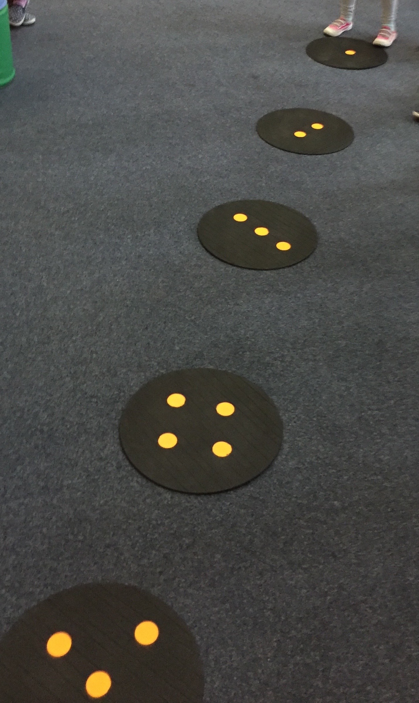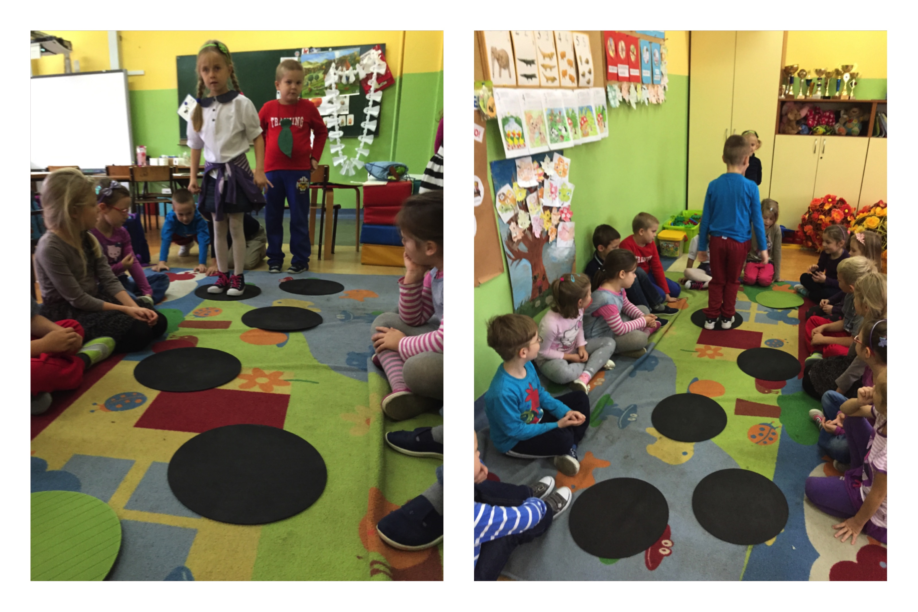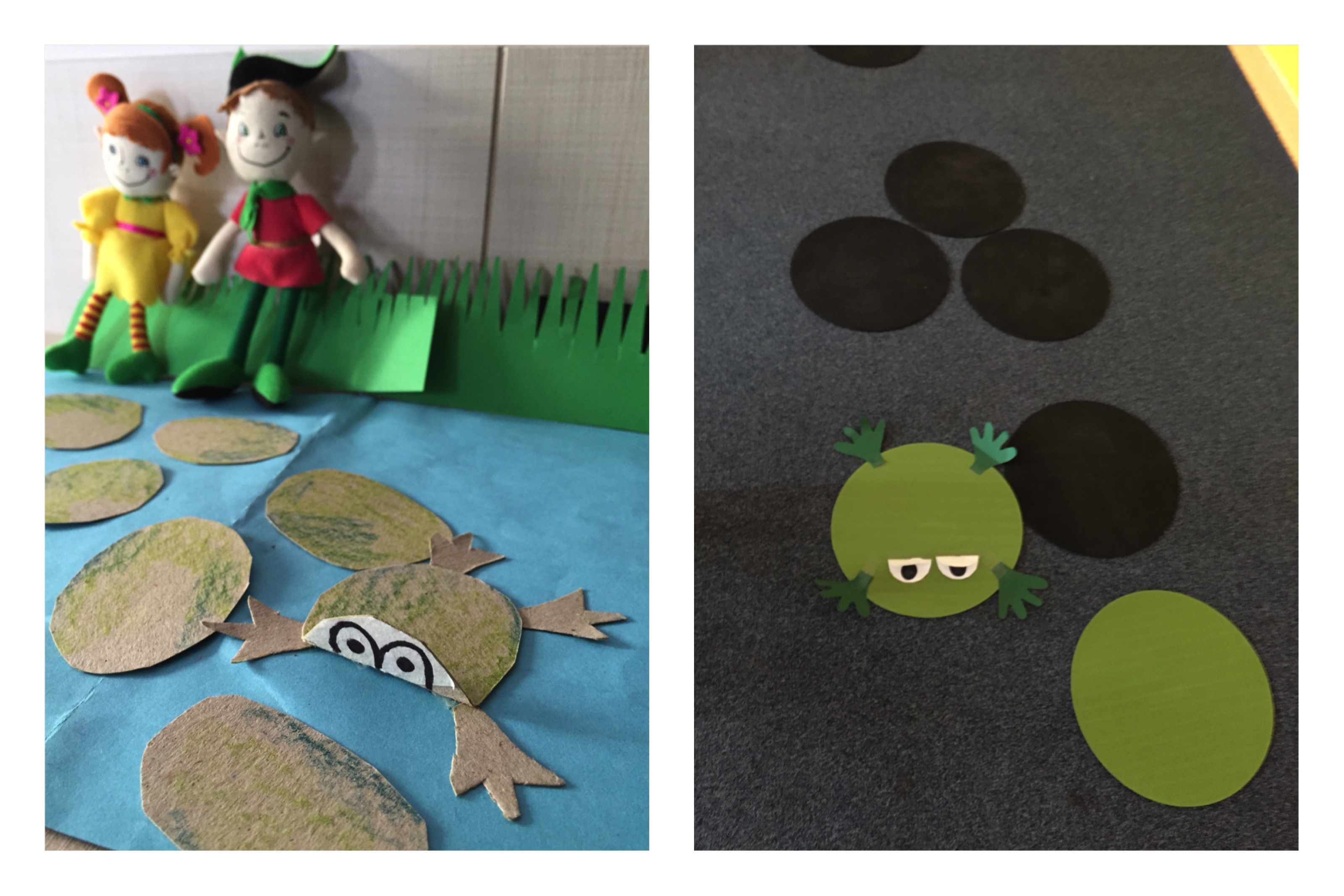 a potem z „ludzkimi” aktorami. Jak widać podkładki z poprzedniej lekcji uległy transformacji (kropki są pod spodem, dodałam też jedną zieloną, która zamieniała się w żabę) i teraz odgrywają tytułową rolę stepping stones.