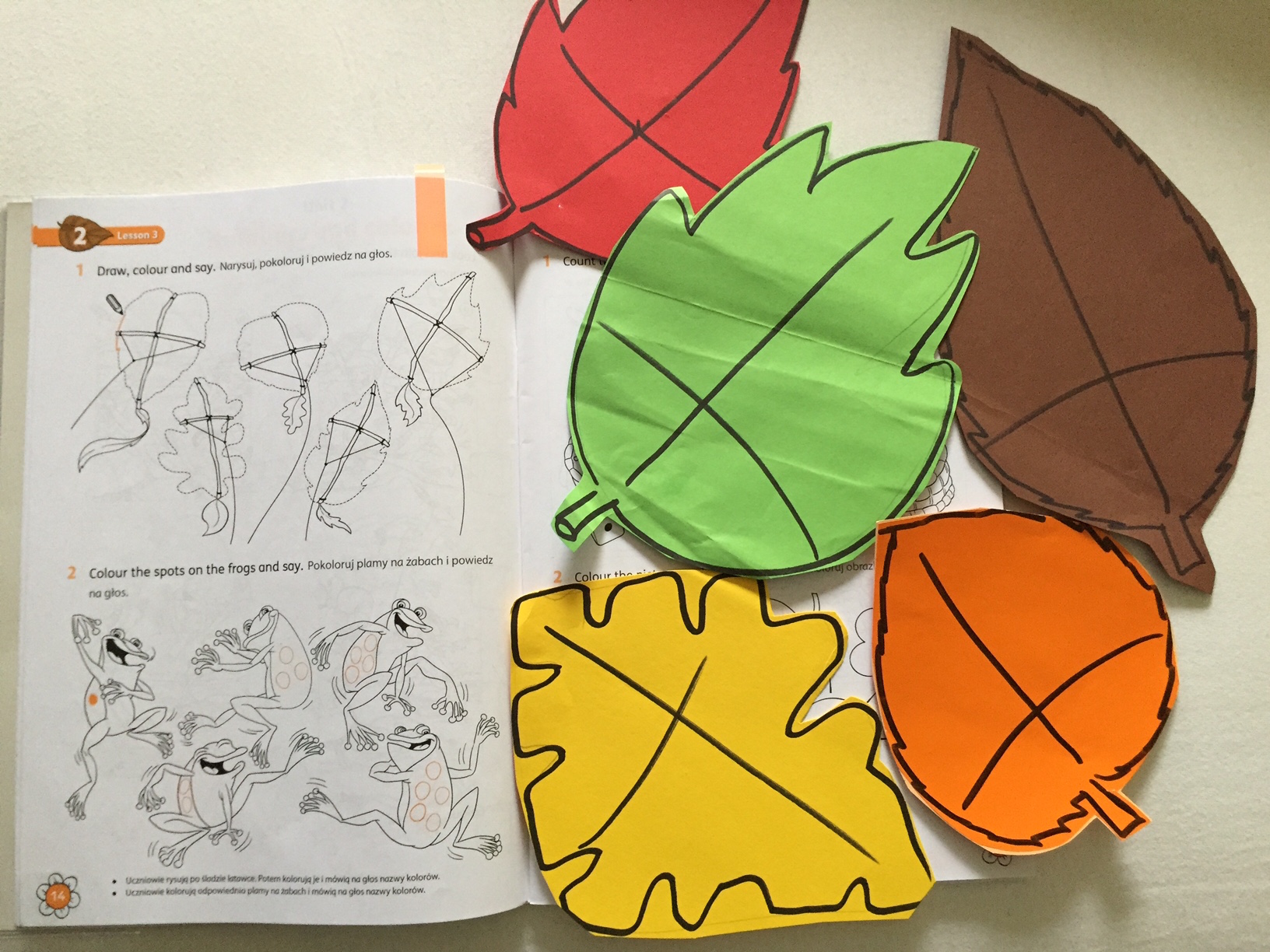 Na części kolejnej lekcji poznaliśmy nazwy pięciu kolorów (podręcznik str. 16): red (czerwony), orange (pomarańczowy), brown (brązowy), green (zielony), yellow (żółty). Paleta jest nieprzypadkowa, pozostajemy bowiem w tematyce jesieni. Na kolejnej lekcji będziemy puszczać kolorowe latawce zrobione z jesiennych liści, zbierać grzyby, orzechy i liście.