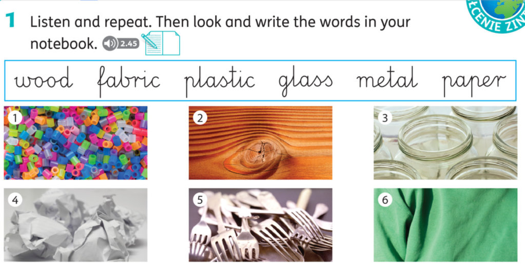 Najpierw poznaliśmy nazwy surowców, z których najczęściej wykonane są przedmioty wokół nas (podręcznik Explore Treetops 2, str 54). Kliknij play▶️ i powtarzaj za nagraniem.