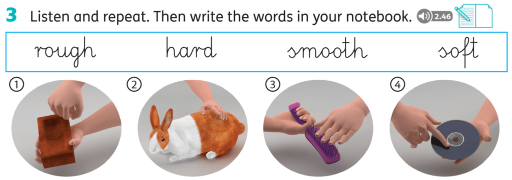 A teraz cztery przymiotniki opisujące odczucia związane z różnymi materiałami: rough – szorstki, hard – twardy, smooth – gładki, soft – miękki. Kliknij play▶️ i powtarzaj za nagraniem.