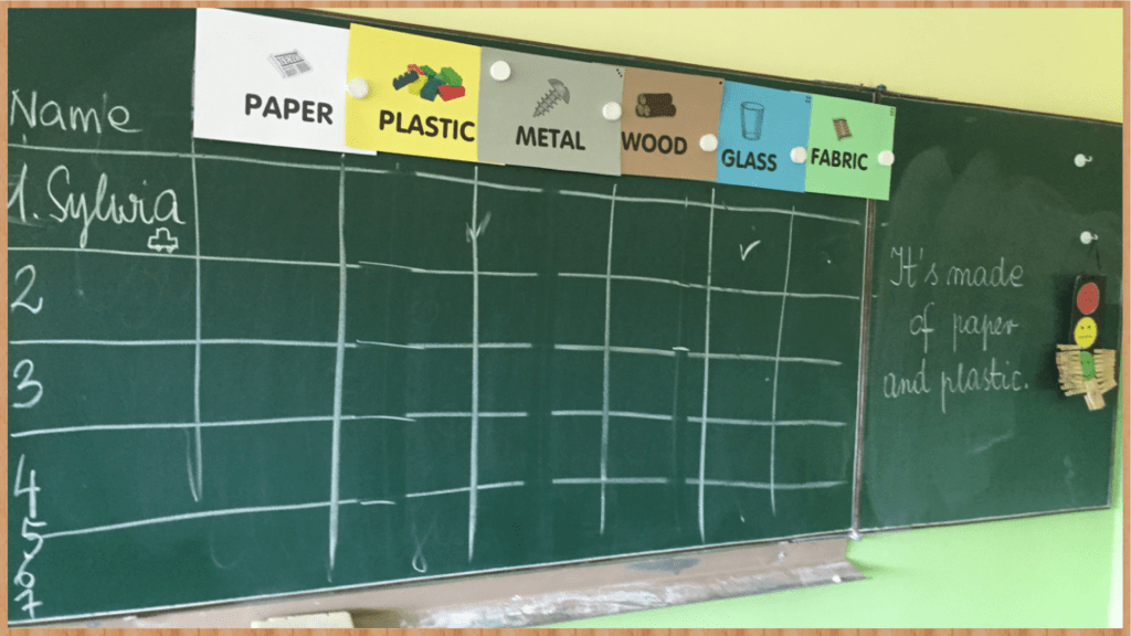 Dziś jedna z tych lekcji, które trudno zrobić sobie samemu w domu, bo brakuje najważniejszego: gadania z kolegami i koleżankami z klasy. Dziś uczyliśmy się rozróżniania i nazywania różnych materiałów z jakich zrobione są przedmioty. A wszystko to po to, by w zaciszu oddzielnych pokoików do pracy (breakout rooms) dowiedzieć się z czego inni zrobili swoje junk toys (zabawki z materiałów z odzysku) oraz powiedzieć im z czego jest zrobiona nasza zabawka. Nie ma nagrania z tego, jak dzieci pracowały w pokojach, ale samą lekcję oczywiście możesz zobaczyć (TU).