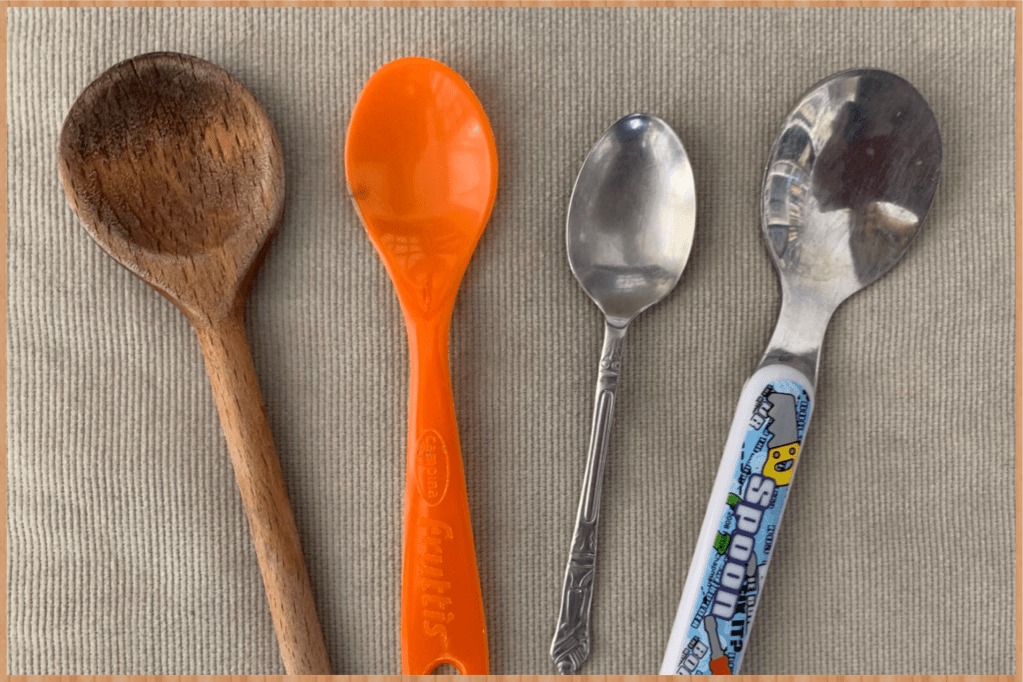 Potem na lekcji sięgnęłam po moje wielkie Lego pudło i wyciągałam z niego różne przedmioty i pytałam dzieci z czego są zrobione. Popatrz na przykład na moją kolekcję łyżek (spoons) i odpowiedz na pytanie: What are they made of?